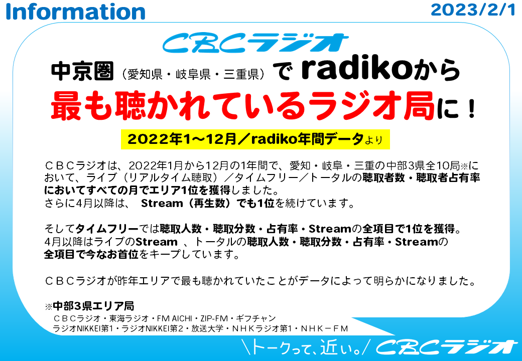 CBCラジオは、2022年1月から12月の1年間で、愛知・岐阜・三重の中部3県全10局※において、ライブ(リアルタイム聴取)/タイムフリー/トータルの聴取者数・聴取者占有率においてすべての月でエリア1位を獲得しました。
