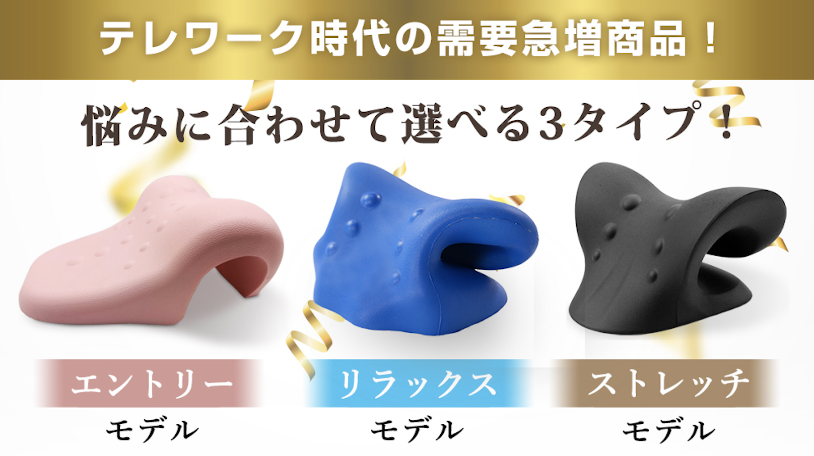 コロナ禍で身体を動かす機会が少なくなっている方向けに”首・肩周りの負担を軽減”するために開発された首枕(弊社通称:ネックリラックスピロー)。悩みに合わせて選べる3パターンを販売中。雑誌ananやメディア掲載、接骨院での導入実績も持つ大人気シリーズ。