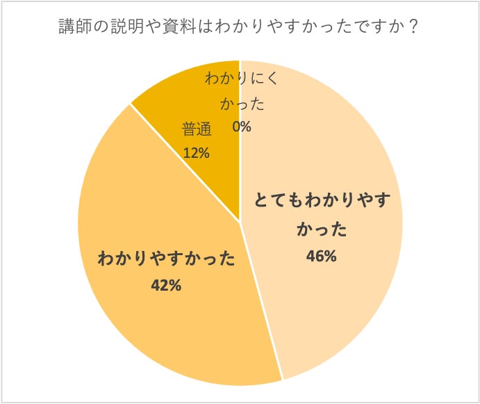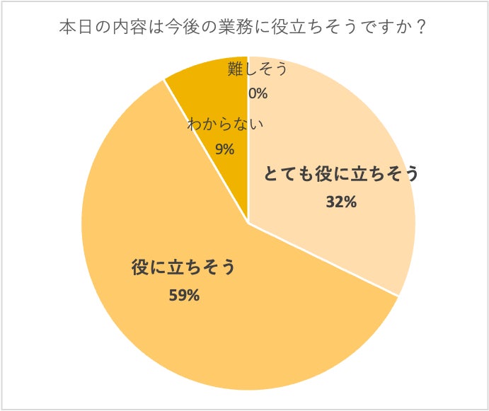 ご参加いただいた20代から60代以上の方に参加者アンケートをとった結果、今後の業務へのお役立ち度は「91%」、研修の説明や資料のわかりやすさも「91%」、全体的な満足度は「86%」という結果になりました。