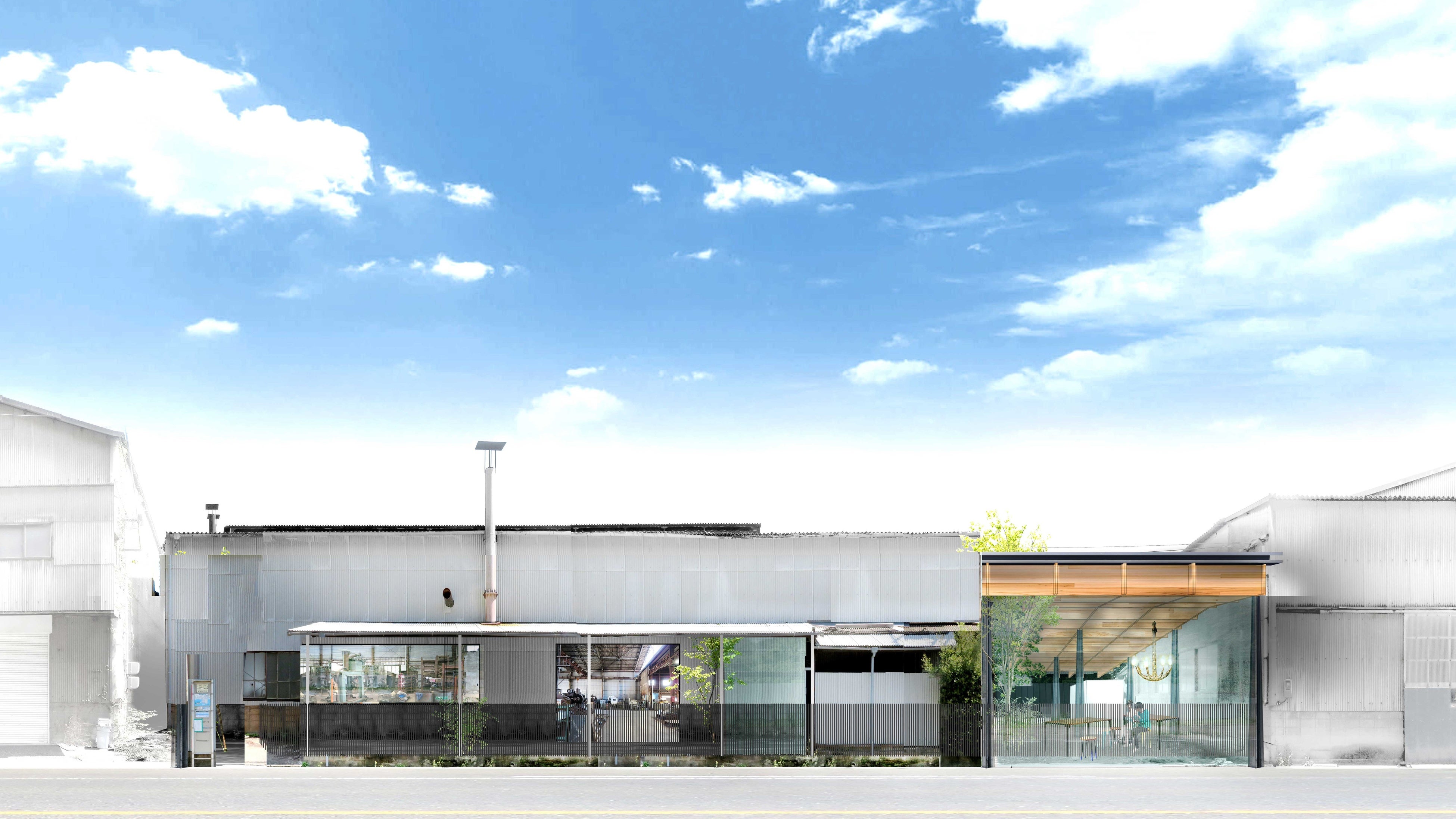 設計は、イタリアDedalo Minosse 2007/2008国際建築賞 Under40グランプリ受賞の「ホロコースト記念館」などを手掛けた近畿大学教授の建築家・前田圭介氏が担当。「santo(サント)」の新たなアクティビティを包含する、おおらかな屋根が作り出す軒下空間を特徴としている。「TAonTA」の家具の構造からインスピレーションを得て、鉄骨の十字柱の上に家具スケールの華奢な鉄骨部材で組んだはしご状のフィーレンディールトラスを、針葉樹合板で挟み込んだシンプルな構成によって、温かみのある力強い空間を実現。スレートで覆われた工場が立ち並ぶ鉄鋼団地のフラッグシップとして、新たなランドマークになることを目指している。