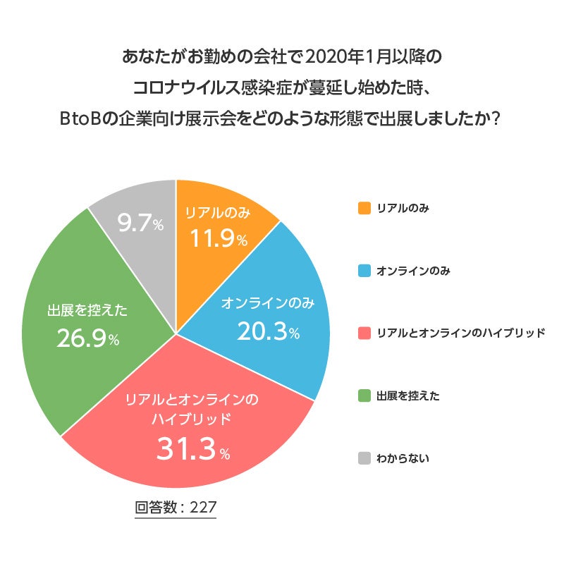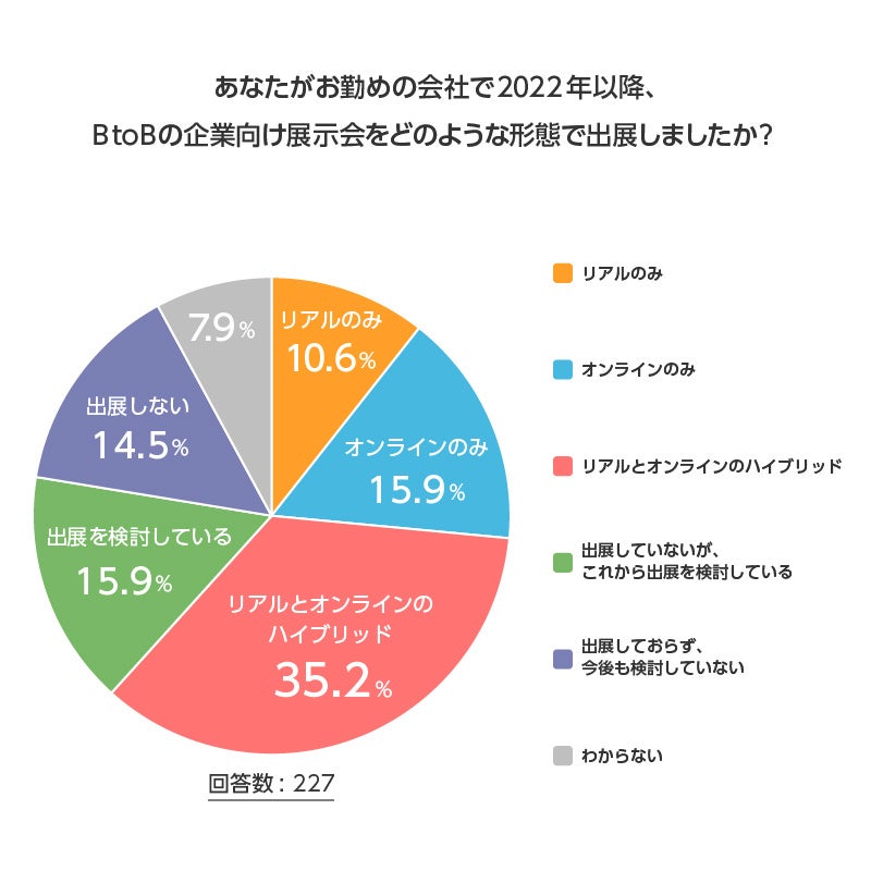 オンライン展示会のみを出展している企業は20.3%から15.9%と約5%減少しました。リアルとオンラインのハイブリットで展示会を出展している企業は31.3%から35.2%と、約4%増加しています。