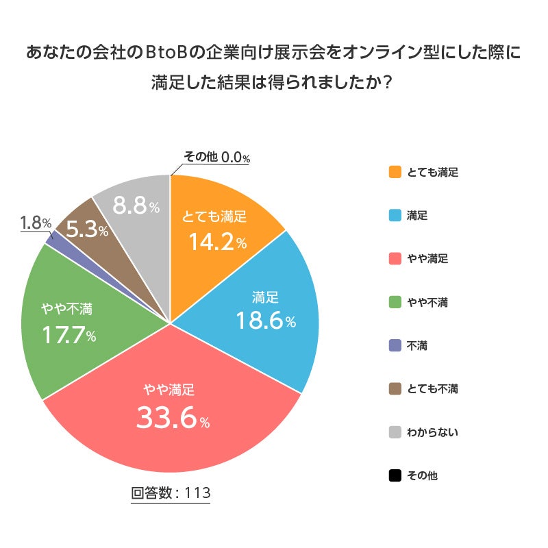 オンライン展示会を出展したBtoB企業113社に聞いたところ、展示会をオンラインにして「満足な結果が得られた」と回答したのが66.4でした。対して、不満があると答えたのが24.8%となり、3人に2人はオンライン展示会のパフォーマンスに満足しているという回答が得られました。