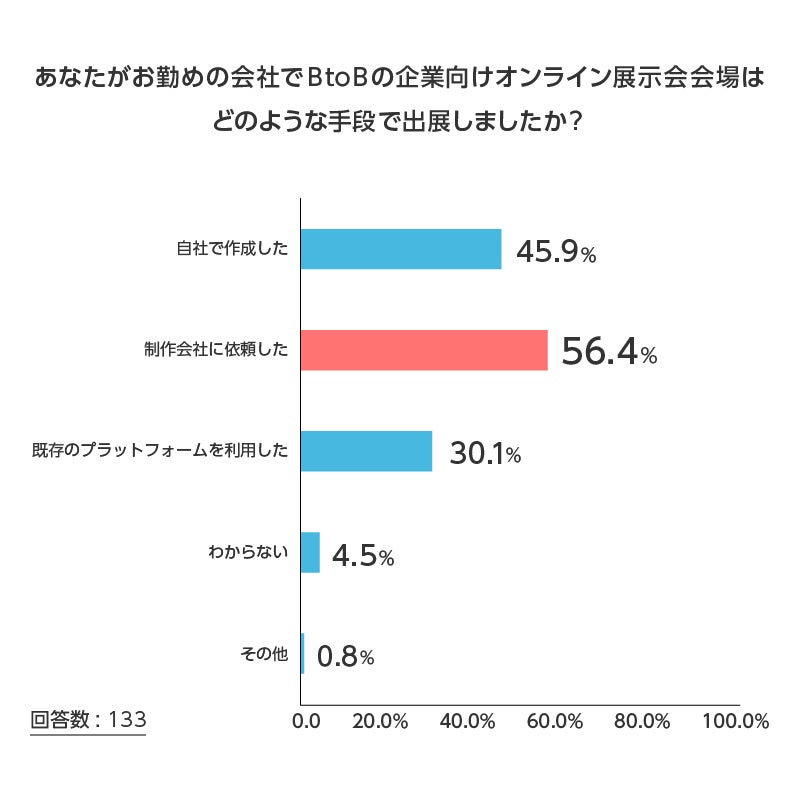 2020年から2022年で展示会を出展するための手段について、「自社で作成した(45.9%)」よりも「制作会社に依頼した(56.4%)」方が約10%ほど割合として上回る結果となりました。次いで「既存の展示会プラットフォームを利用した(30.1%)」が続きます。