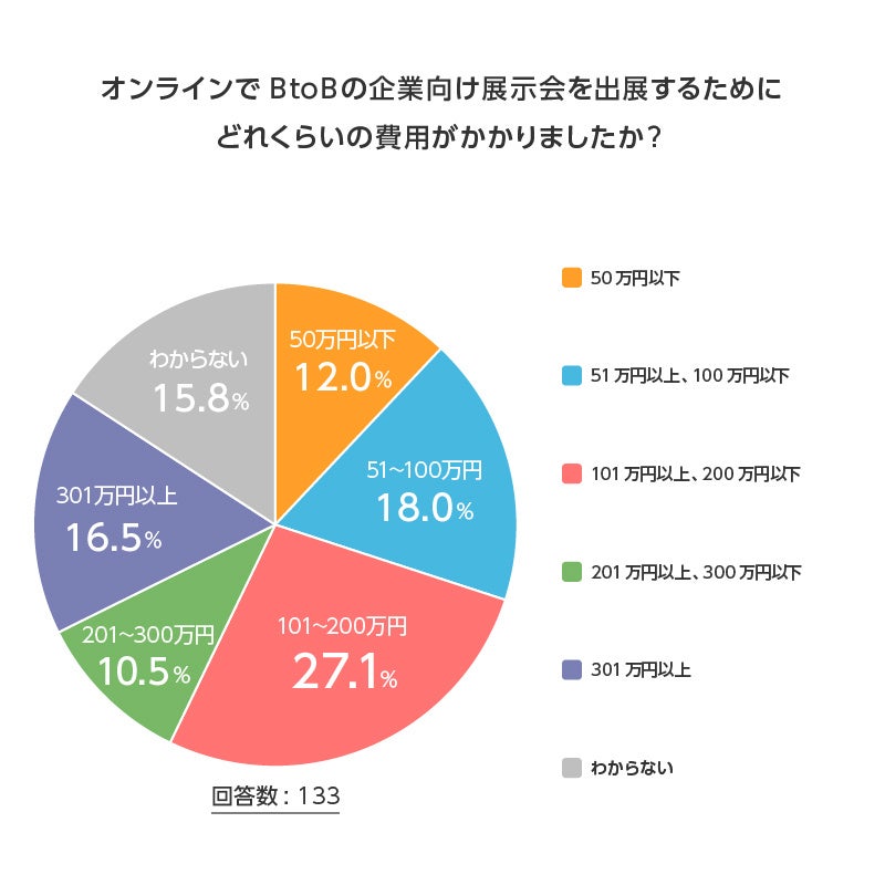 オンラインでBtoBの企業向け展示会を出展するためにかかった費用として一番多かったのが101万円~200万円で全体の27.1%。次いで51万円~100万円が多く18%。200万円以上かかったケースは全体の27%に留まりました。