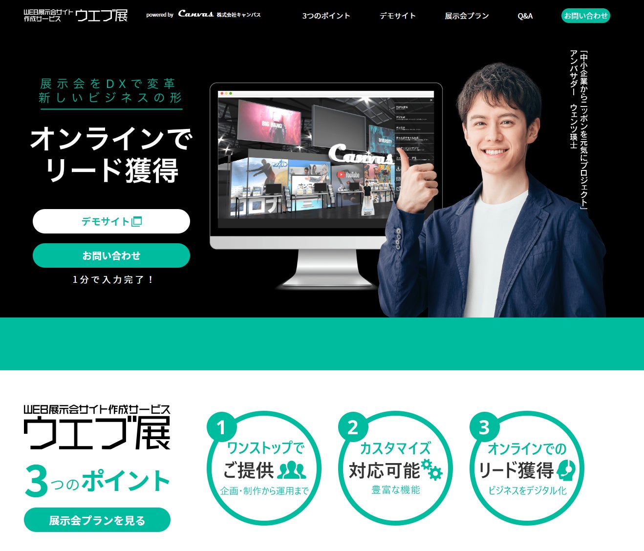 「ウエブ展」はイベント展示会をオンラインで展開できるようになる展示会サイト制作サービスです。今までリアル展示会による名刺交換しかなかったリード獲得方法を、オンラインでリード獲得を可能することで、ビジネスのデジタル化が可能になります。企画・制作から運用までワンストップで提供しており、1日や1週間の公開から常設の展開、動画の制作から展開方法まで、要望に沿ったカスタマイズが可能です。