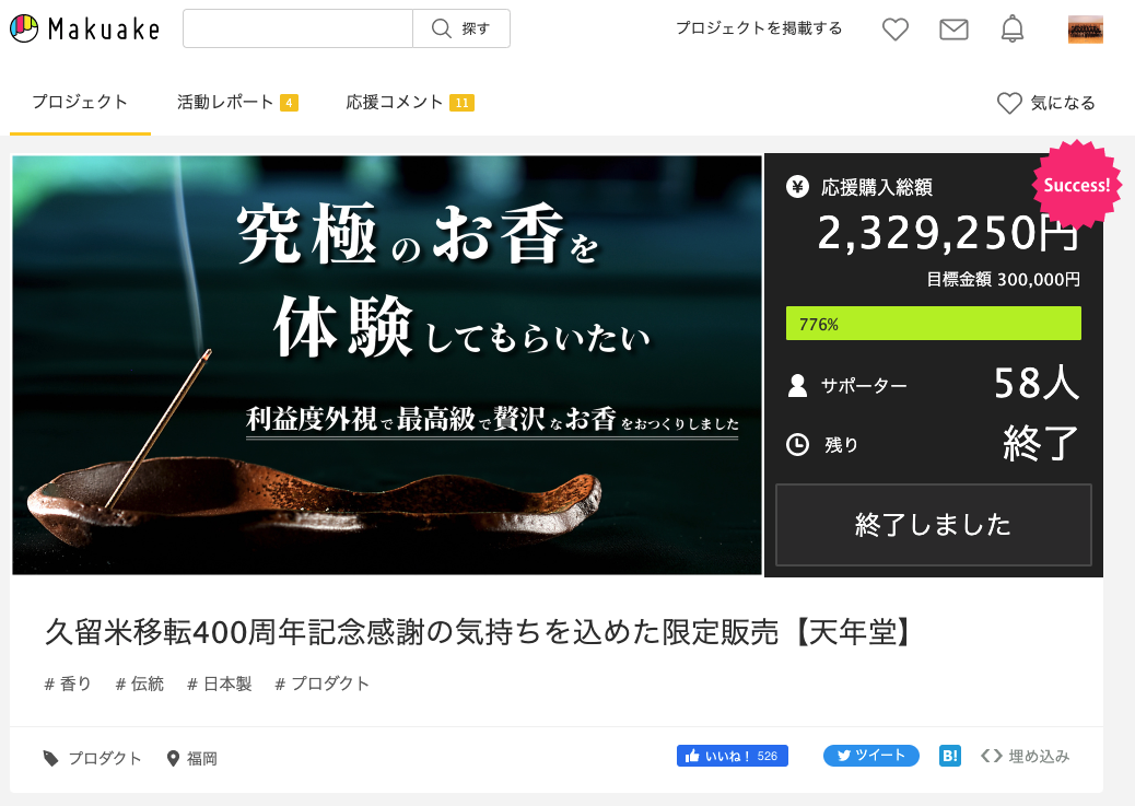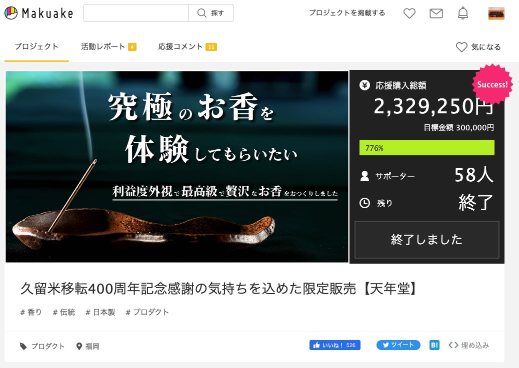 2022年1月にクラウドファンディングMakuake(マクアケ)にて支援者を募集し、応援金額232万円(目標達成率776%)のご支援をいただきました。より多くの方に"最高級で贅沢な究極のお香"を体験していただきたくオンライン一般販売をスタート致しますので改めてご紹介させていただきます。(Makuakeプロジェクトページ:https://www.makuake.com/project/kohotennendo/)