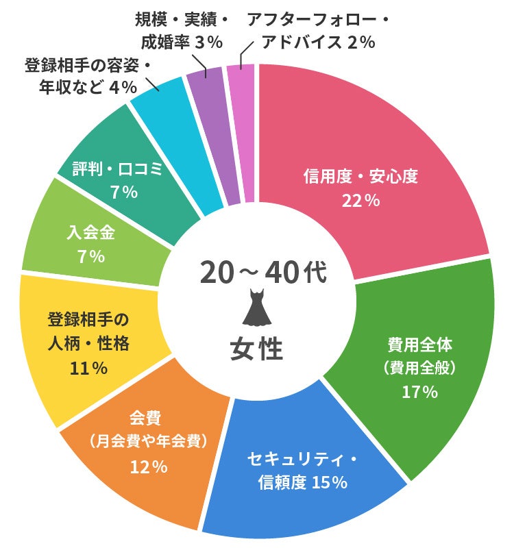 一方、20〜40代女性の回答では、「信頼度・安心度」(22%)に続き、「費用全体」(17%)、「セキュリティ・信頼度」(15%)を重視するという結果になりました。