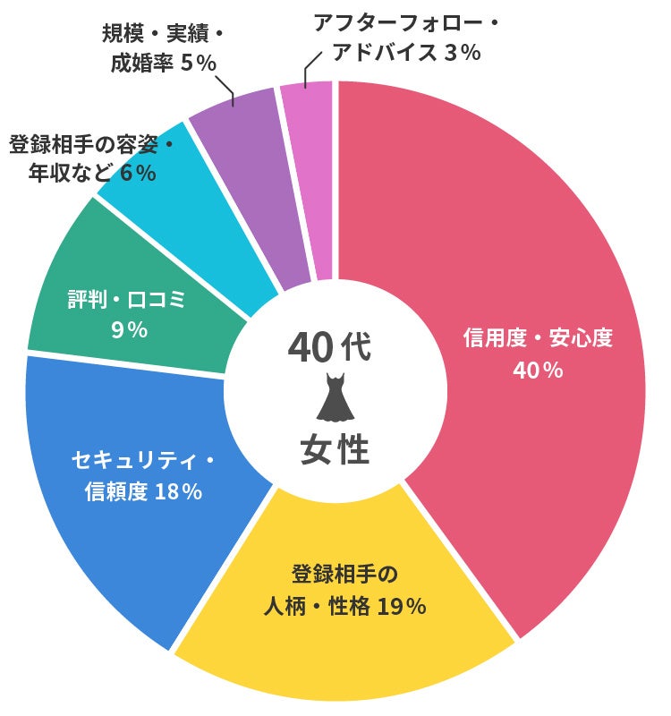 40代女性が重視するポイントは「安心度」の次に「登録相手の人柄・性格」「セキュリティ」「評判・口コミ」と続きます。「セキュリティ」が順位を落とし、「相手の性格」を重視する割合が増えています。