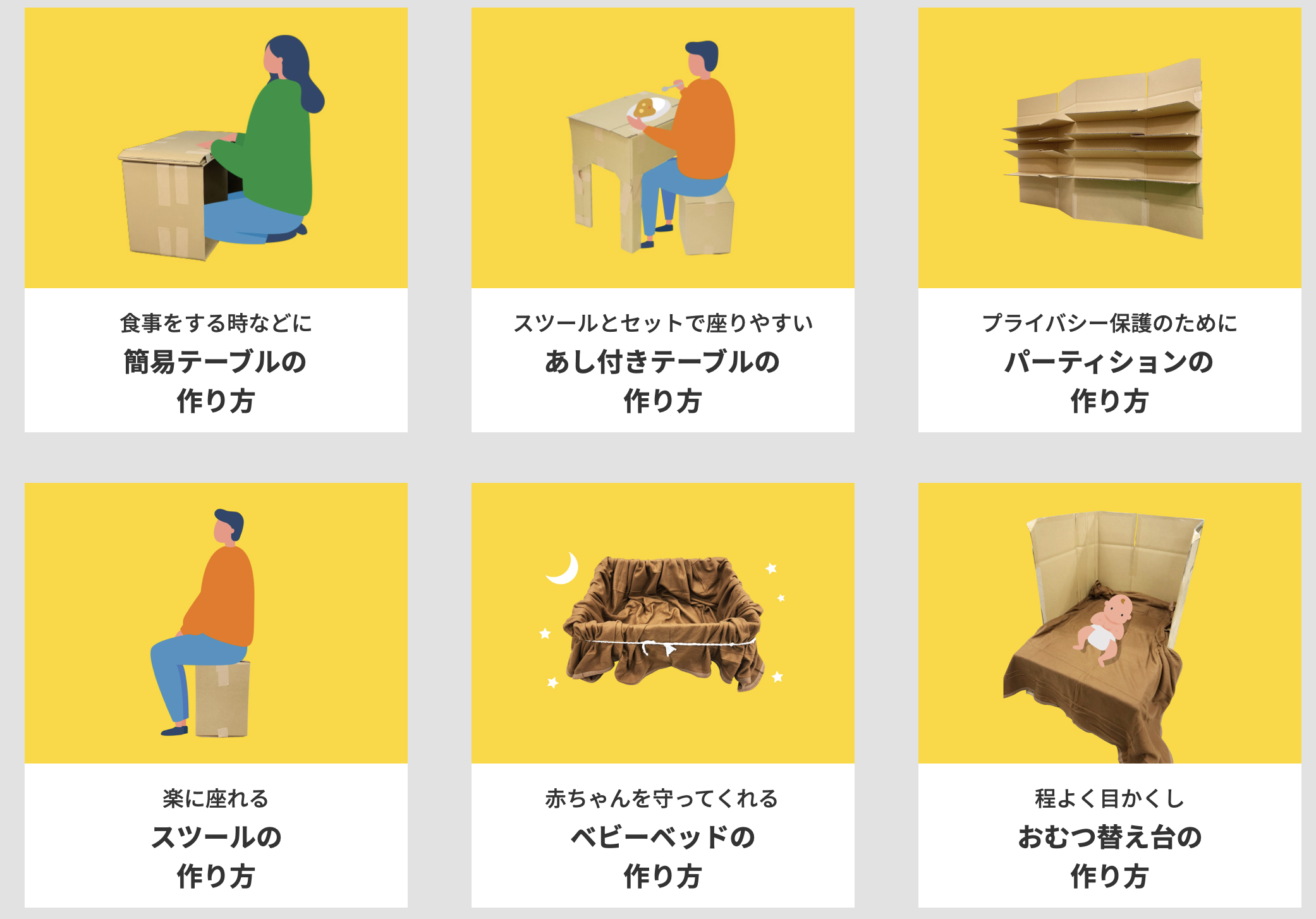 避難所のQOLを支えるために、段ボールで簡単に作れるアイテムを集めたWebサイト「段ボールでまもろう」を開設しました。