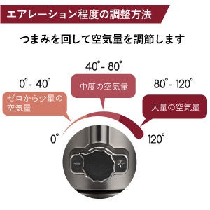 赤ワインをはじめ、白ワインやウイスキー、日本酒、焼酎、その他蒸留酒、ジュースなどにもお使いいただけます。エアレーションのレベルをお好みに調整することも可能。