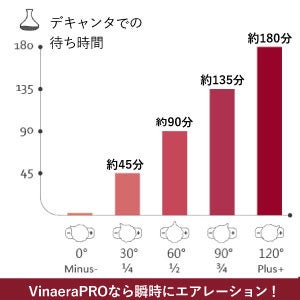 エアレーションとは、ワインを空気と触れ合わせて香りを引き出し、口当たりをまろやかにさせる作業のことです。デキャンタに移し替えて30~180分ほど要します。Vinaera Proは、手間のかかるエアレーションを、ボタンを1つで瞬時に行うことができます。