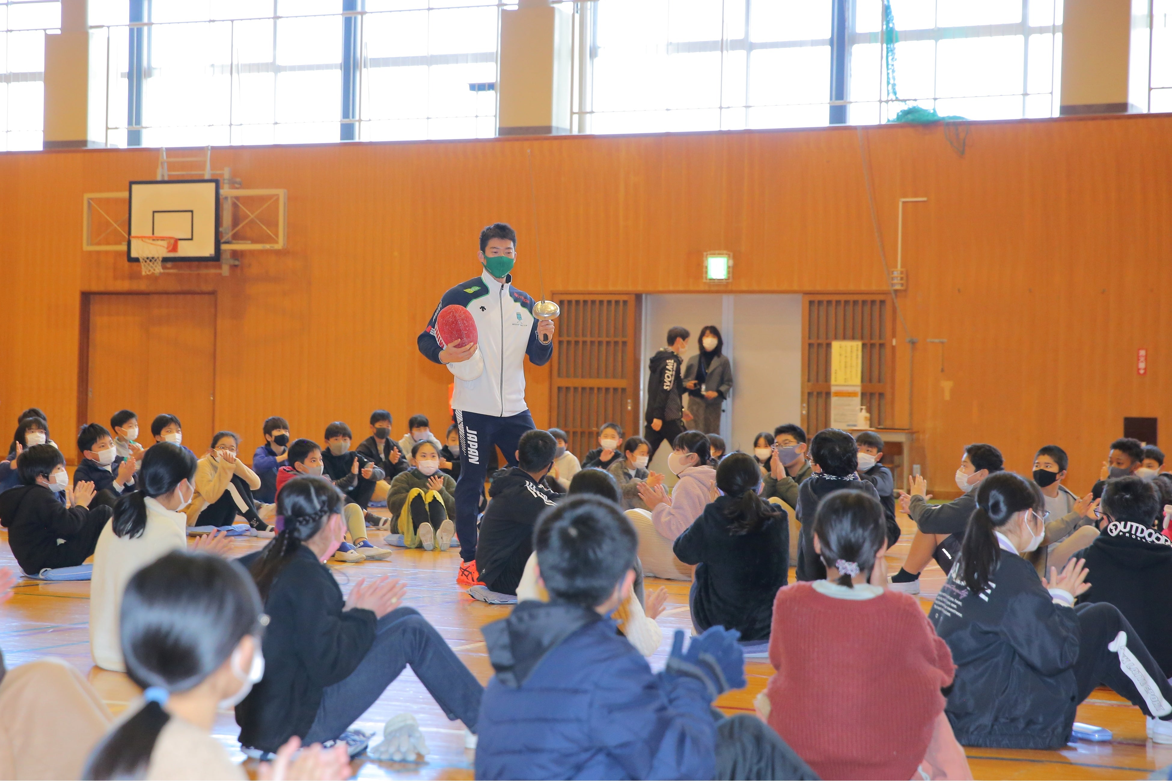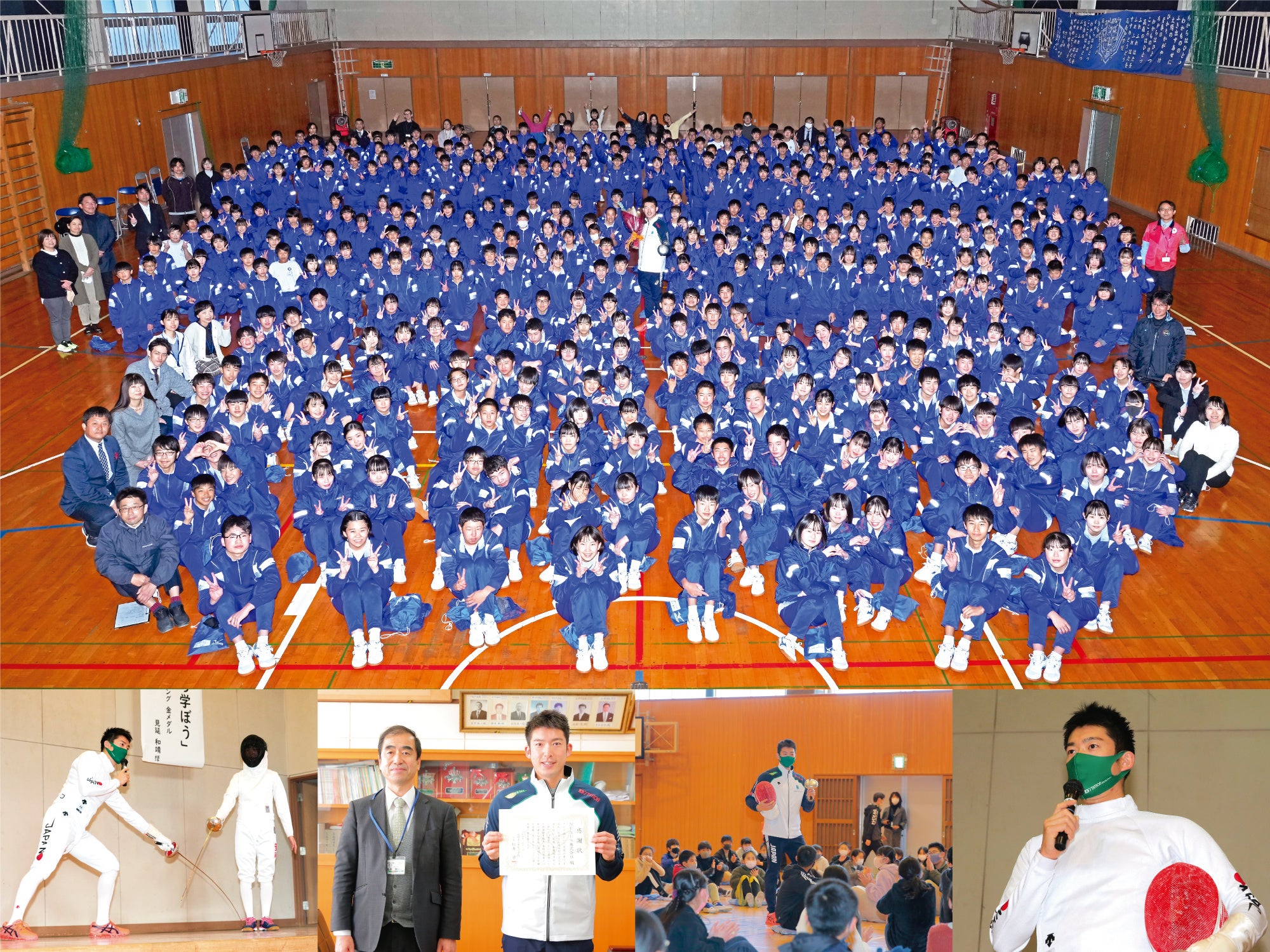 当日は、(1)見延選手と先生によるトークセッション、(2)生徒のみなさんからの質問コーナー、(3)生徒のみなさんとの記念撮影、(4)見延選手から将来に向けたエールのメッセージ、高崎市立 高南中学校では、フェンシング県大会入賞の在校生徒さんと一緒にフェンシングルールの説明などをさせて頂きました。