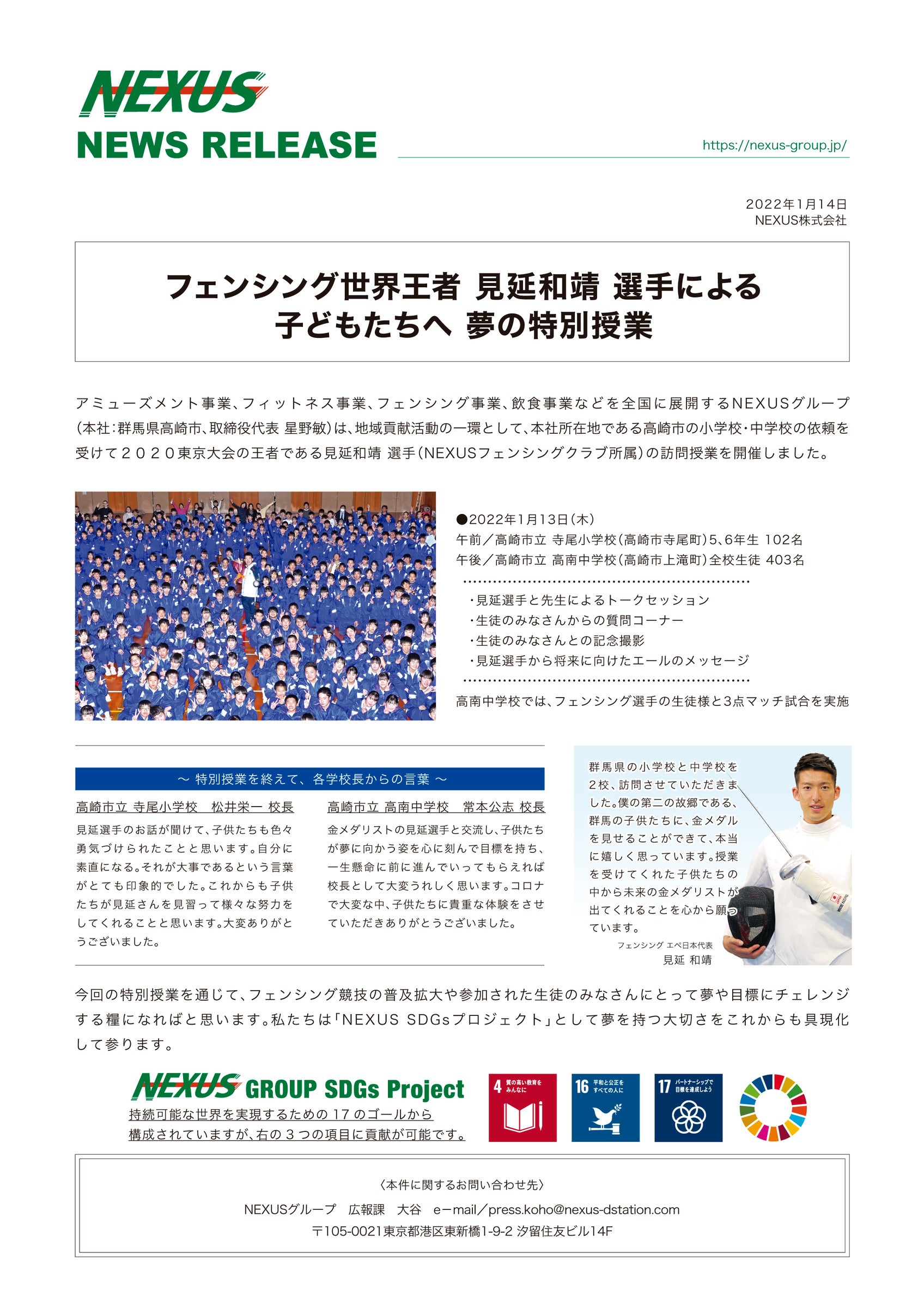 アミューズメント事業を全国に展開するNEXUSグループ(本社:群馬・東京)は、2022年1月13日に高崎市の小中学校より依頼を受け、2020東京大会のフェンシング種目エペ団体王者である、見延和靖 選手の「夢の特別授業」を開講しました。