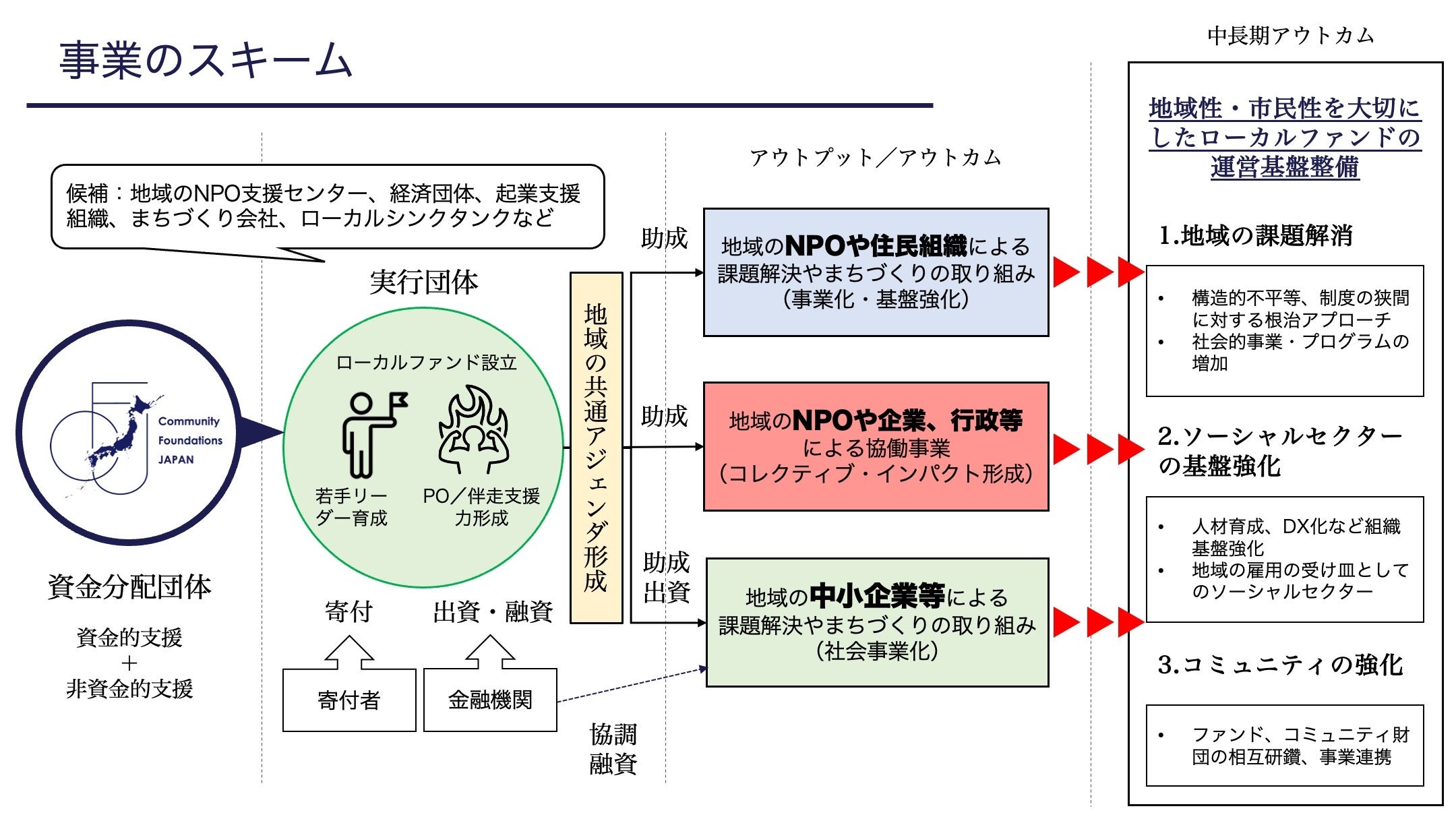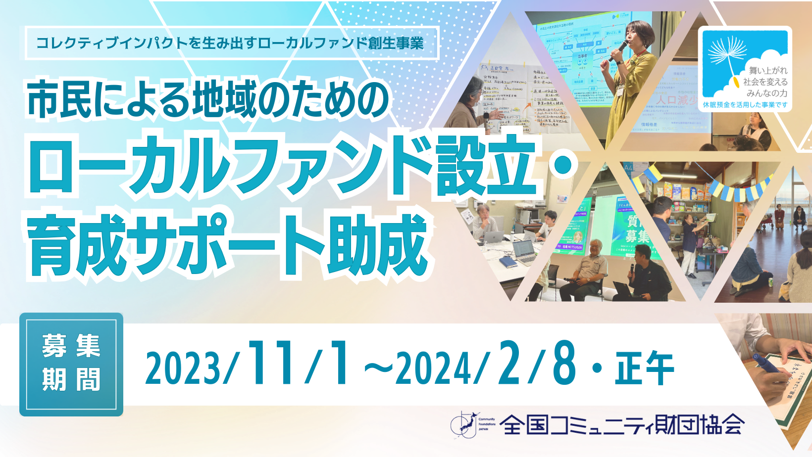 全国コミュニティ財団協会では、休眠預金を活用して、全国の地方都市において、若者や⼥性等の地域の多様な主体が参画する「コレクティブインパクトを⽣み出すローカルファンド設⽴・運営」のためのスタートアップ助成を⾏います。これにより助成先が、助成期間中にローカルファンドとして⾃律的に経営できる状況まで成⻑し、持続的に地域課題解決に貢献することを⽬指します。