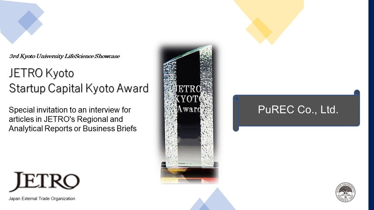 2022年3月2日(日本時間)、シーズ・技術を米国で事業化することに興味を持つアカデミア発のベンチャー向けのイベント・「第3回京都大学ライフサイエンスショーケース@San Diego 2022」が開催され、PuREC(本社:島根県出雲市)がJETRO KYOTO Awardを受賞しましたのでお知らせいたします。
