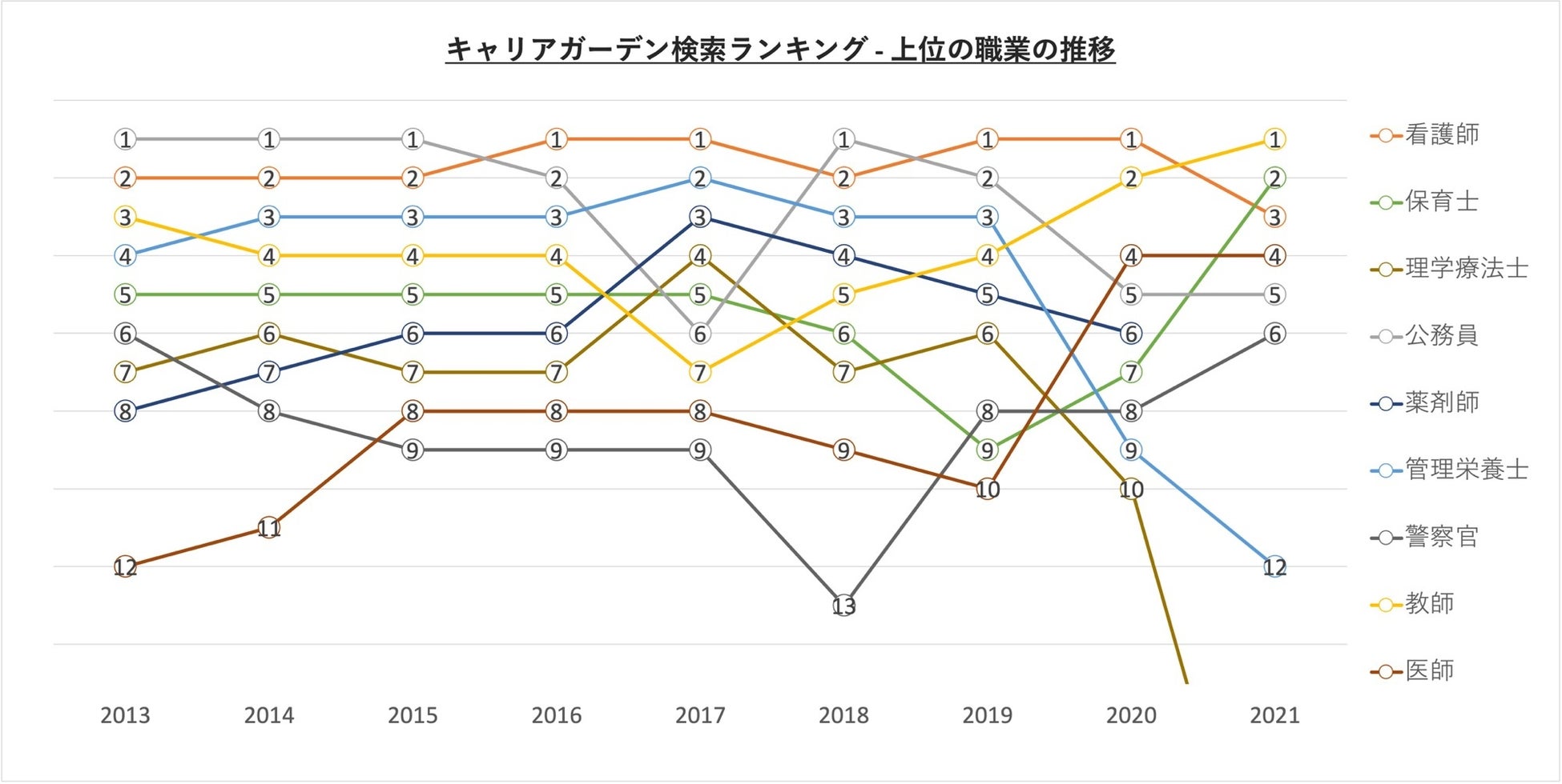株式会社ノードプレース(本社:東京都渋谷区、代表取締役:吉田 友和)は、職業情報サイト「キャリアガーデン」のサイト内検索クエリの調査を行いました。2021年の結果および、2013年から2021年までの検索数上位職業ランキングの推移をご報告いたします。