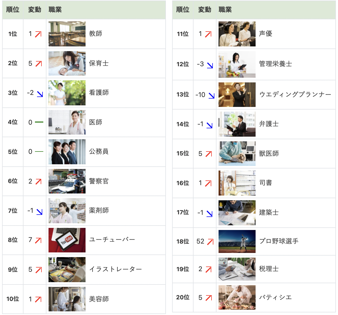 「ユーチューバー」「イラストレーター」「美容師」が初めてトップ10入りした一方、「管理栄養士」が前年9位から12位へ、「理学療法士」が前年10位から23位へと順位を下げています。