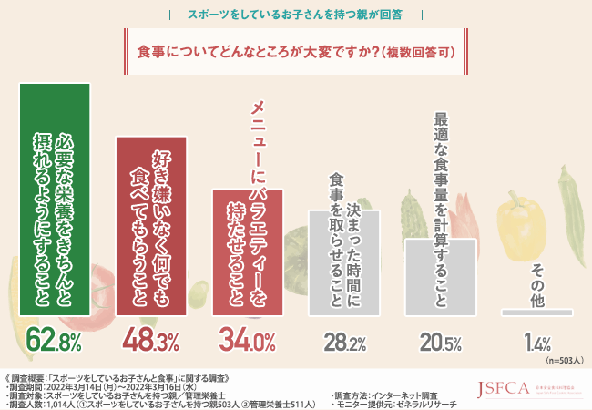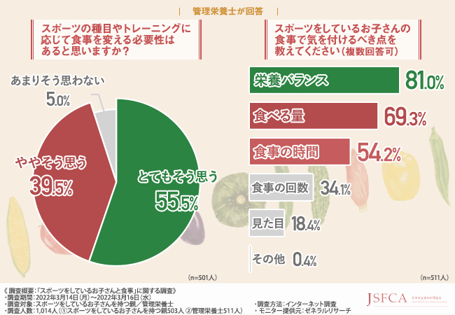 日本安全食料料理協会(所在地:東京都港区)は、➀スポーツをしているお子さんを持つ親②管理栄養士を対象に、「スポーツをしているお子さんと食事」に関する調査を実施しました。