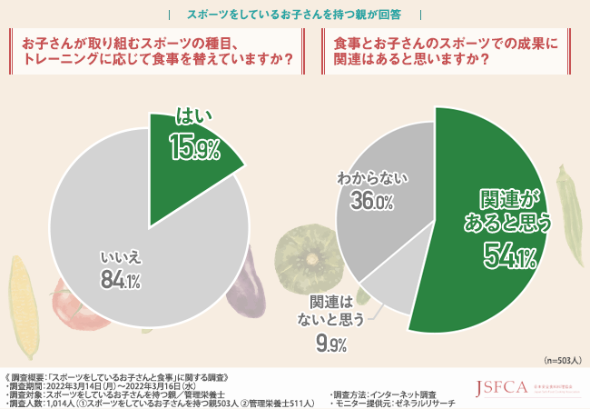 そこで、「お子さんが取り組むスポーツの種目、トレーニングに応じて食事を変えていますか?」と質問したところ、『はい(15.9%)』『いいえ(84.9%)』という結果となりました。