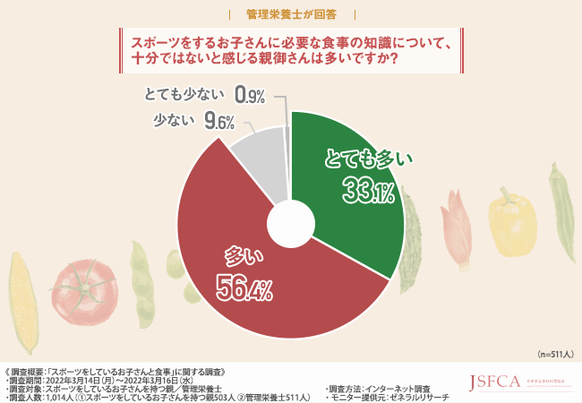 そこで今回、スポーツフードマイスター資格認定試験(https://www.asc-jp.com/diet/sportsfood/)を取り仕切る日本安全食料料理協会は、➀スポーツをしているお子さんを持つ親②管理栄養士を対象に、「スポーツをしているお子さんと食事」に関する調査を実施しました。