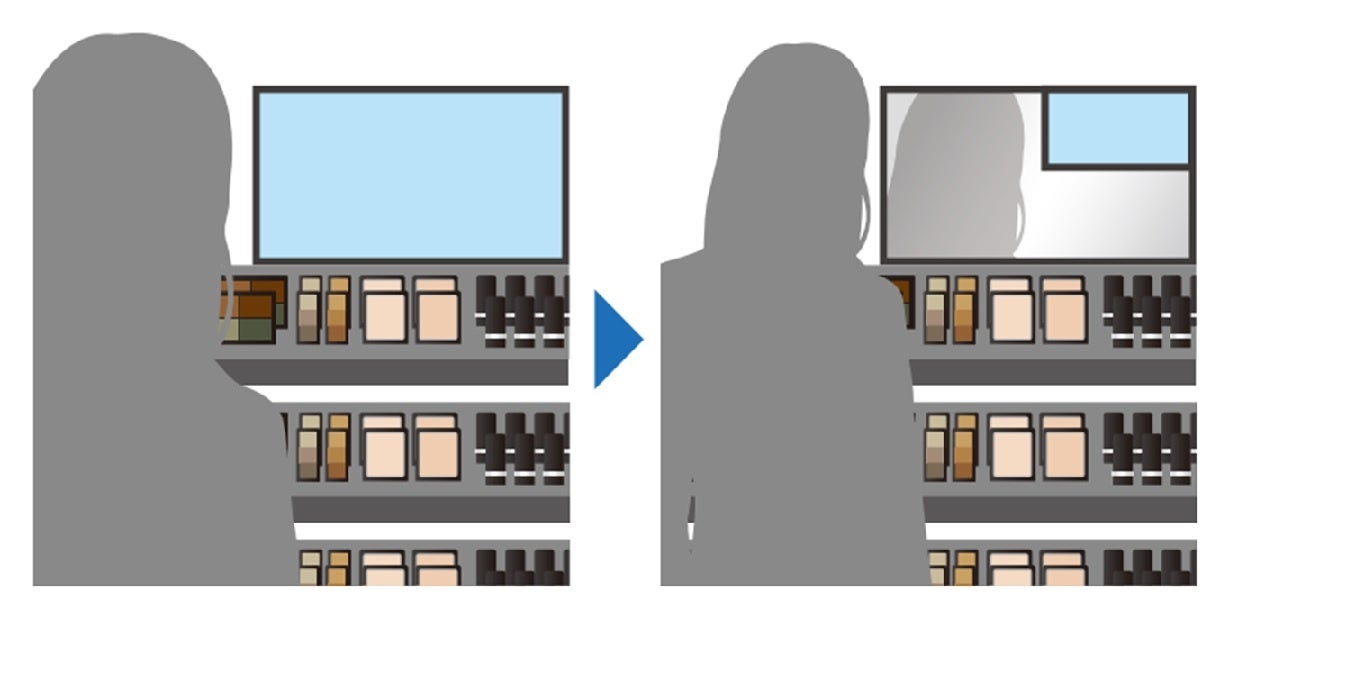 「ミラーモニター」は全画面でプロモーション映像を放映し、お客様が近づくと映像部分が小さくなって端に寄るため、鏡として使用してもらいながら商品やブランドの宣伝効果を発揮します。商品選択や購入時のお客様の利便性・納得感の向上と、店頭で商品やブランドの情報を訴求することで、気づきや想起、興味喚起を促します。モニターは、縦でも横でも設置可能で、任意の場所に任意の大きさで小画面を出すことができ、大小複数の動画を流すことが可能です。