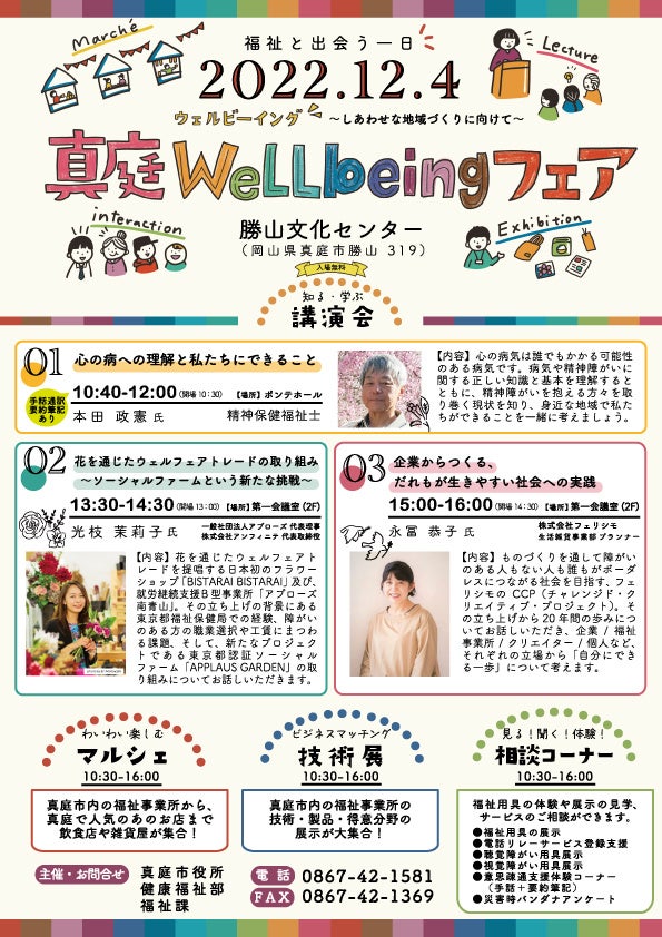 そうした時代の流れを受けて、岡山県北の真庭市では、「しあわせな地域づくりに向けて」をテーマに、2022年12月4日(日)、「勝山文化センター」(岡山県真庭市勝山319)にて、「真庭WeLLbeingフェア」を開催します!