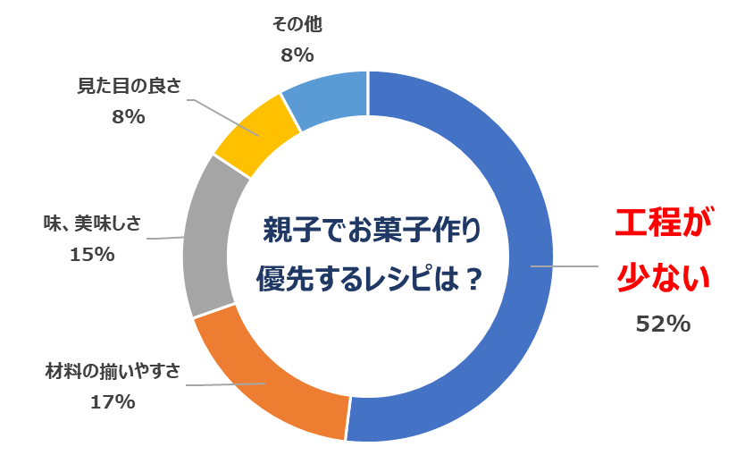 その結果、約3割の女性が「子どもとお菓子作りをする機会が増えた」と回答しました。また、バレンタインプレゼントは、約4割の女性が「手作り派」と回答し、さらに、子どもと作る場合、約5割の女性が「工程数の少ないレシピ」を希望していることが分かりました。