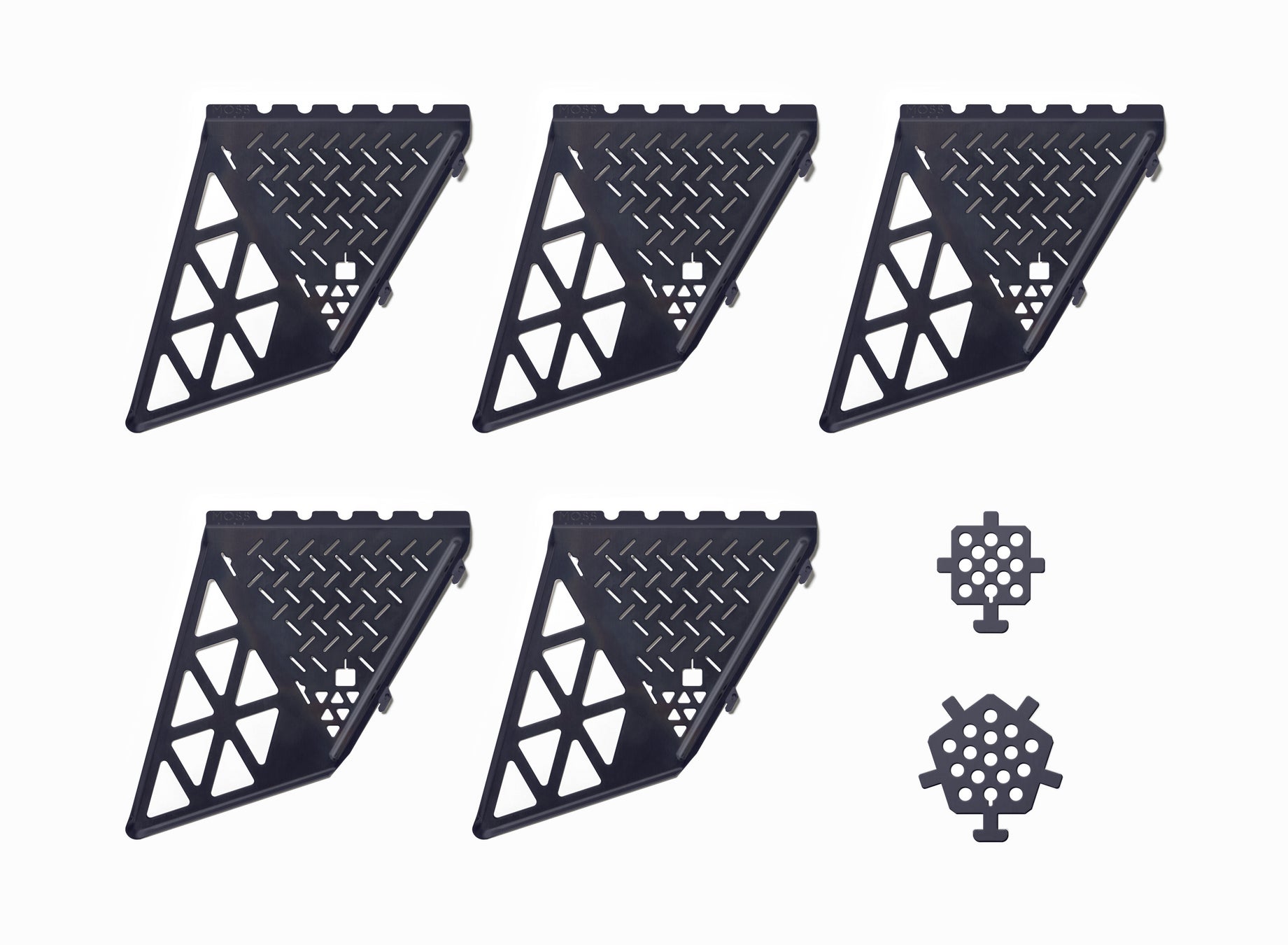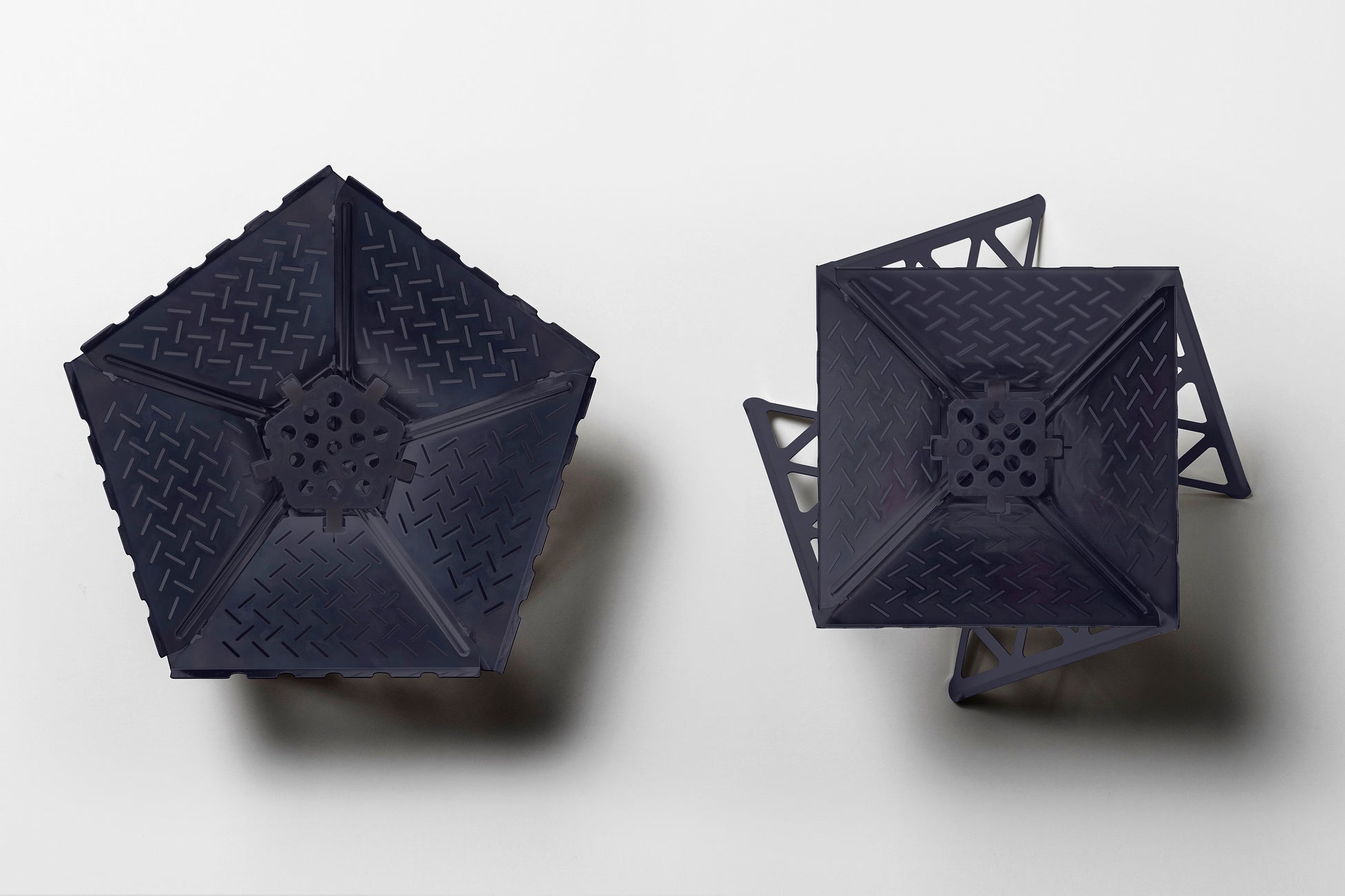 同じ形のプレートが5枚で1セット。4枚で組み立てるとコンパクトで高さのあるタイプ、5枚で組み立てると開口部が広く地面に近いタイプ。シーンに合わせて2通りの使い方が選べる、組み立て式の焚き火スタンドです。