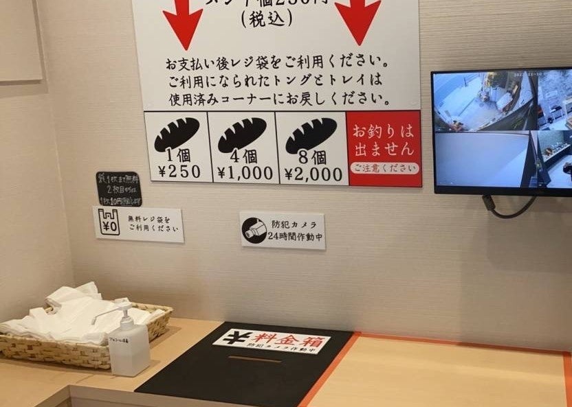 完全非接触という無人で販売されるベーカリーは、食パンを含み30~40種類(税込み価格250円均一〈食パンの一部は除く〉)。