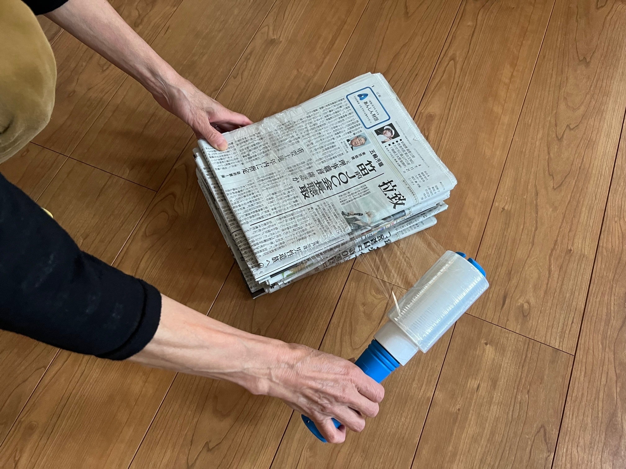 ハンディラップは樹脂製のハンドルに伸縮性のあるフィルムがついた梱包用フィルムのことです。粘着性がなく、フィルムを 巻きつけるだけでダンボールや古紙、長尺なものを1つにまとめることができ、ビニール紐のように縛った後に崩れにくい点がメリットです。