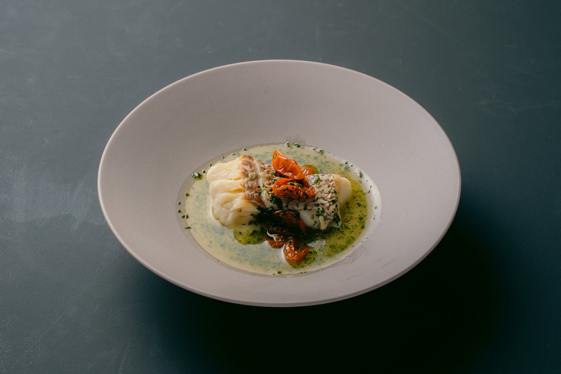 一人一皿でご用意する鯛のアクアパッツァ。鯛のアラやアサリのダシ、野菜でとった旨みたっぷりのスープは、ピザの耳を浸してお召し上がりいただくのもおすすめです。