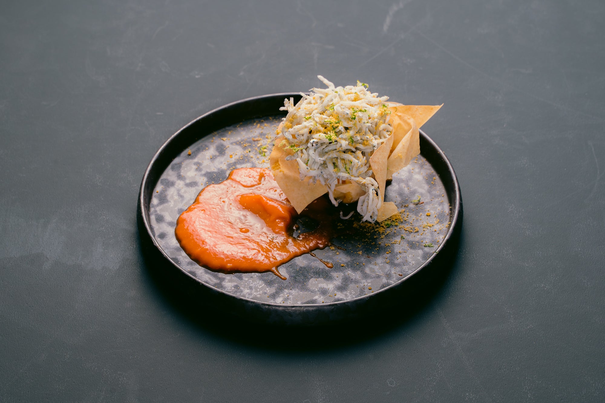 しらす 温玉 パートフィロ ボッタルガ すだち パプリカトマトのソース
