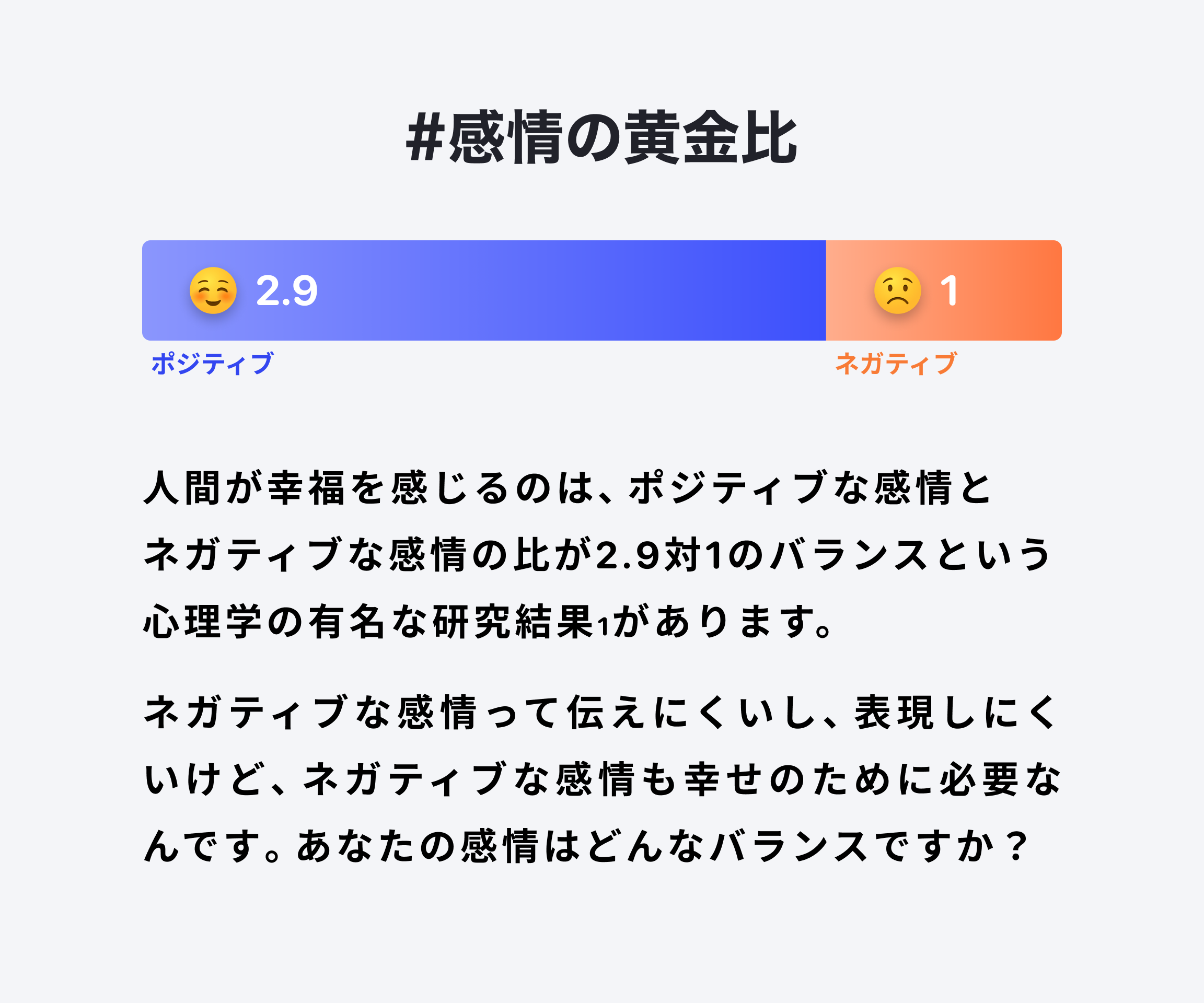 人間が幸福を感じるのは、ポジティブな感情とネガティブな感情の比が2.9対1のバランスという心理学の有名な研究結果*があり、幸福のためにネガティブな感情も必要なことが明らかになっています。ところが現在は自身のメンタルヘルスを測る術はなく、自分の心理状態や感情に気づくことは容易ではありません。