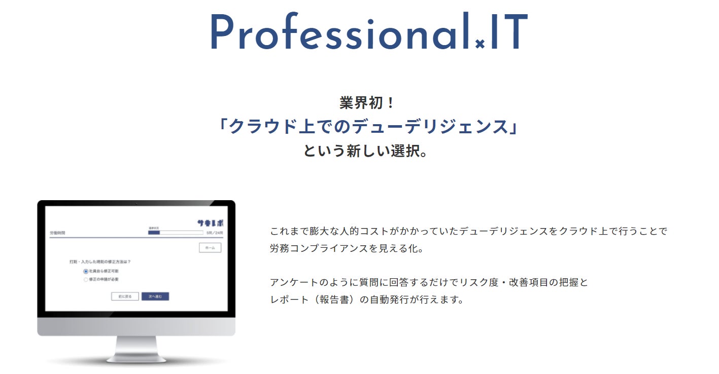 「サキレポ」は、これまで紙と人で行ってきた品質はそのままに、ネット上で気軽にリスク調査ができるクラウドデューデリジェンス®サービスです。これまで膨大な人的コストがかかっていたデューデリジェンスをクラウド上で行うことで労務コンプライアンスを見える化。アンケートのように質問に回答するだけでリスク度・改善項目の把握とレポート(報告書)の自動発行が行えます。(https://minamotoc.jp/sakirepo/)
