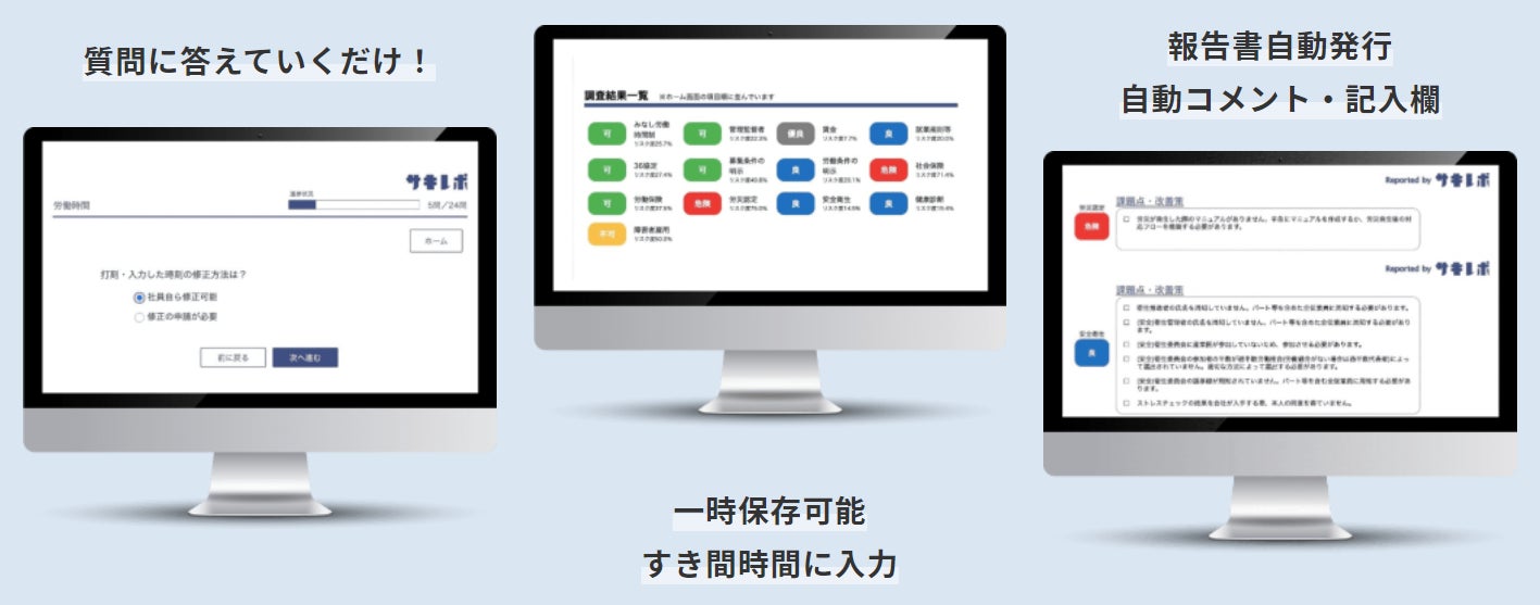 - 空き時間に、最短5分でリスク調査:サキレポはクラウド型システムです。その為、IDとパスワードでどこにいてもインターネット環境と端末さえあればログインが可能。中小企業の忙しい経営者、担当者の方でも隙間時間にアンケートに答えていくだけでリスクの見える化・改善点の洗い出しができます。