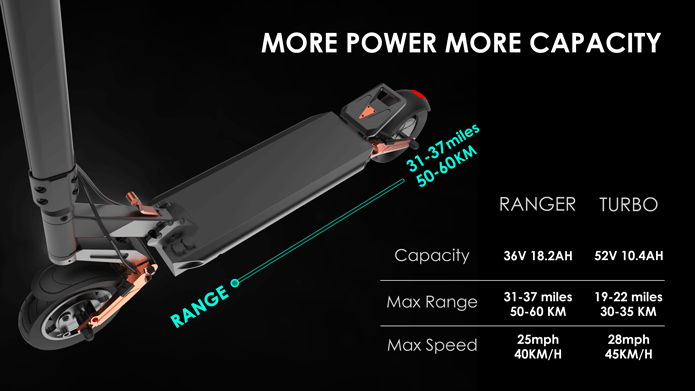 1回の充電で、TURBOは30~35Km、RANGERは50~60Kmの走行が可能!