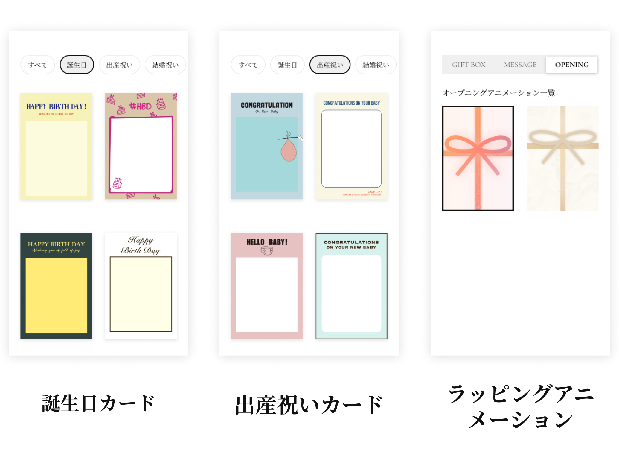 メッセージカード、ラッピング、開封アニメーションの種類追加:メッセージカードを誕生日向け、出産祝い向けなどカテゴリーから選択可能に。複数のラッピング追加で複雑なカスタマイズも可能に。