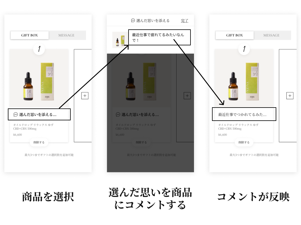 候補に選んだ商品への添え書きと、組み合わせ可能なカスタマイズ機能により、より贈り主の選んだプロセスや思いがよく伝わり、オンラインで贈るのにはまだまだ抵抗があるようなギフトをオンラインでも抵抗なく実行できるようにすることを目指しています。