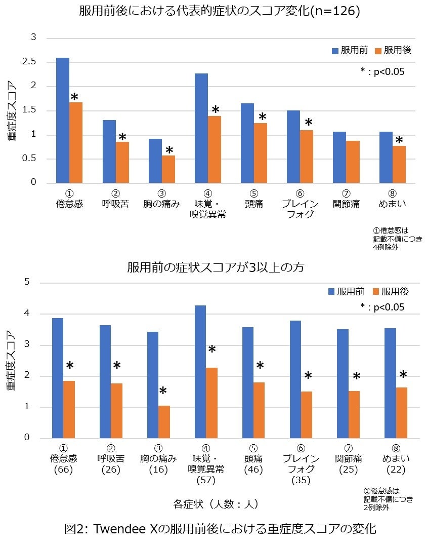 この調査では、新型コロナ感染後の後遺症に悩む方々を対象に、抗酸化サプリメント「Twendee X」を無償提供し、服用前と服用1ヵ月後に、代表的な8つの症状(倦怠感、呼吸苦、胸の痛み、味覚・嗅覚障害、頭痛、ブレインフォグ、関節痛、めまい)についての重症度を6段階でWEBアンケートにて自己申告していただきました(有効回答数 126)。今回の中間報告(集計期間 2021年9月2日~9月28日)では、関節痛を除くすべての症状の重症度スコアが有意に低下していました。さらに各症状において比較的重症の参加者においては、全ての症状における重症度スコアが有意に低下しました。