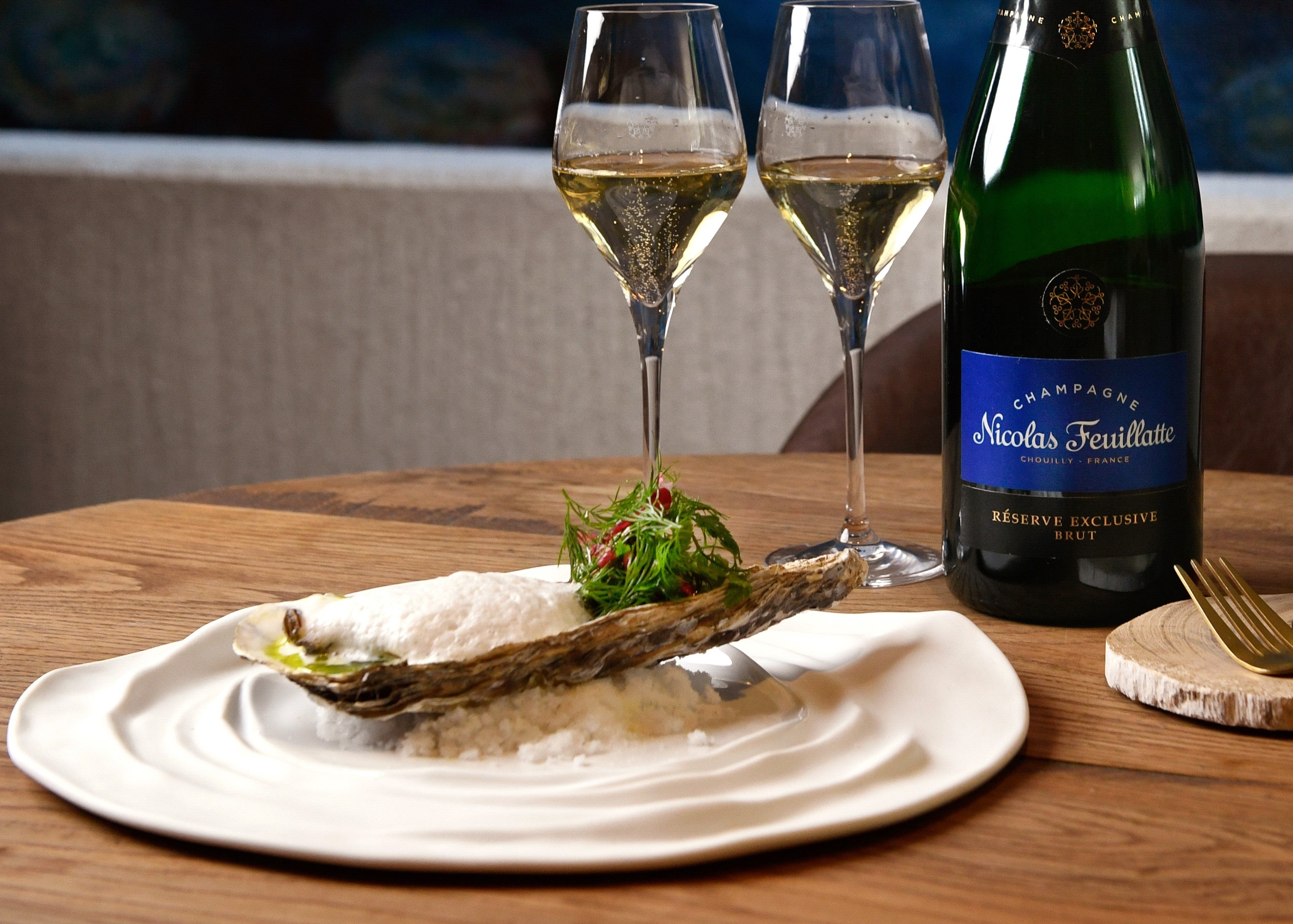 シェフのコメント:「ニコラ・フィアットは上質な感じがありながらも、軽やかで様々なシーンで楽しめます。シャンパンのうまみとカキのうまみの相乗効果を活かしたメニューです。」