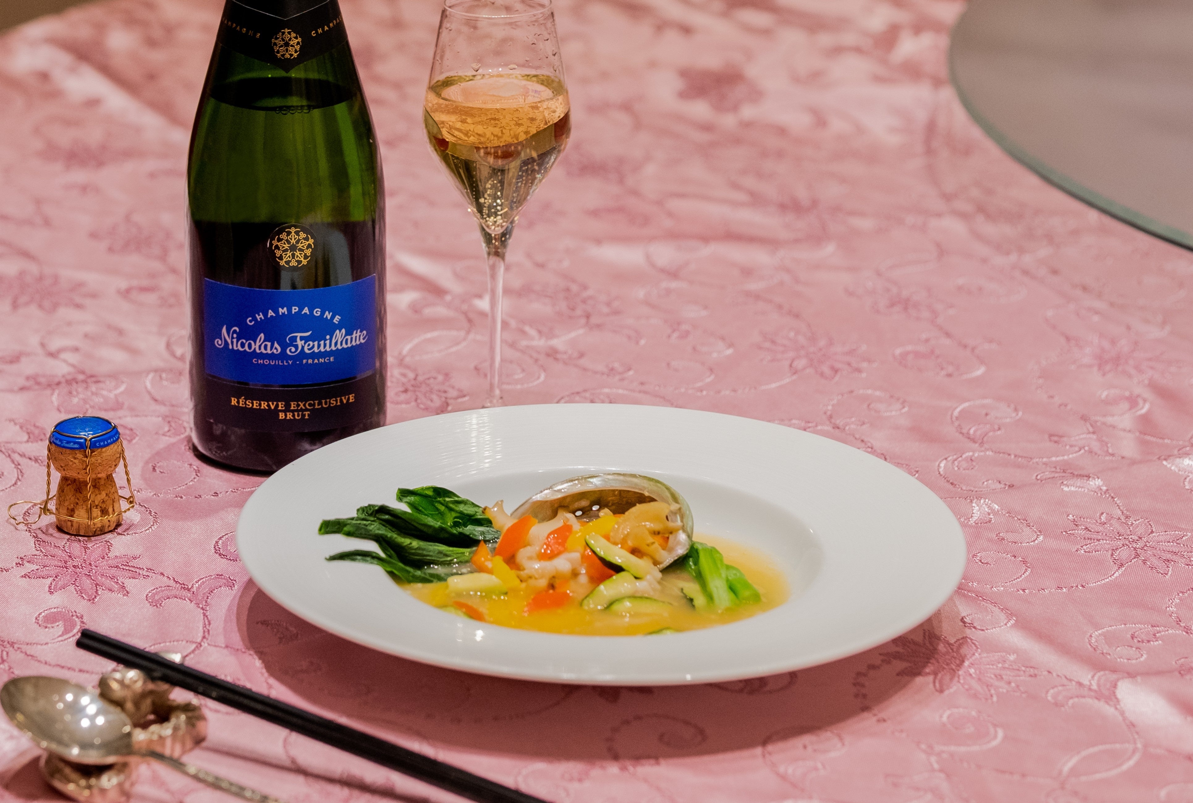 シェフのコメント:「ニコラ・フィアットは上質でバランスがよく自身の優しい料理に合う。シャンパンの香りと旨味が鮑の旨さを引き出すアクセントをイメージしたメニューです。」