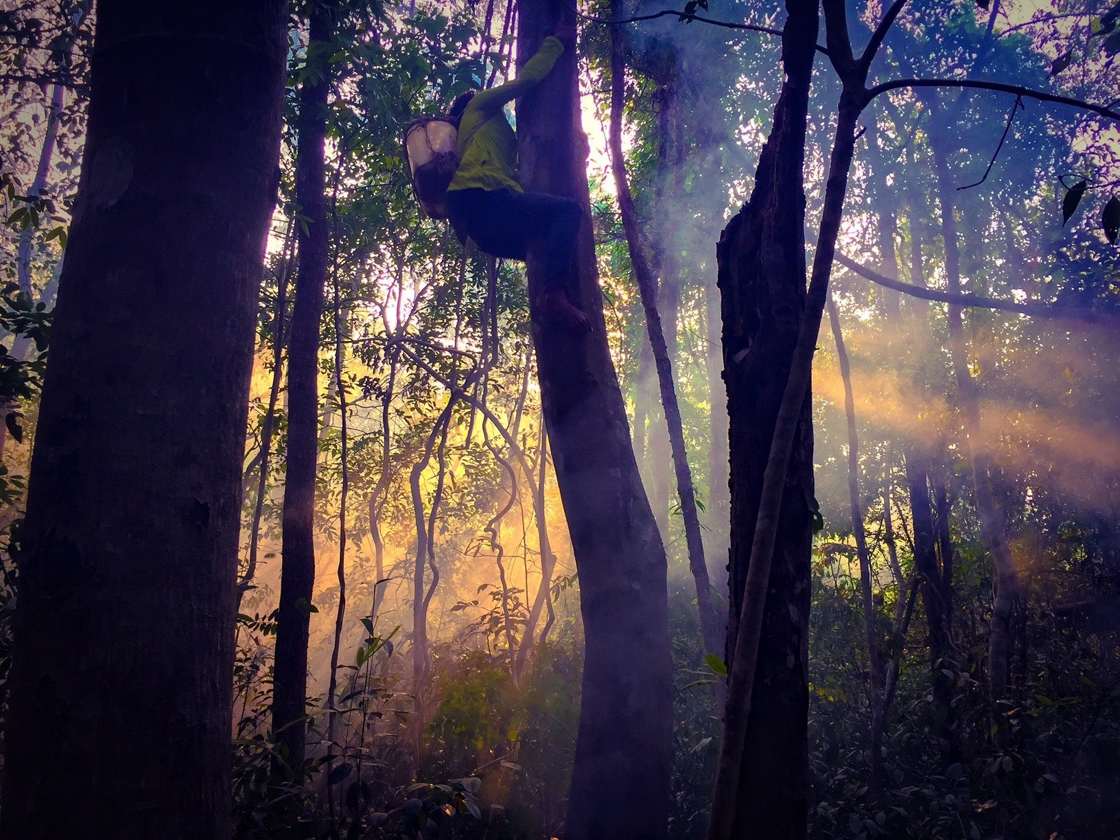 蜂蜜ハンター達は、原生林の中の20メートル以上の樹木に棲む蜜蜂の巣を時には数日間かけて探し回ります。