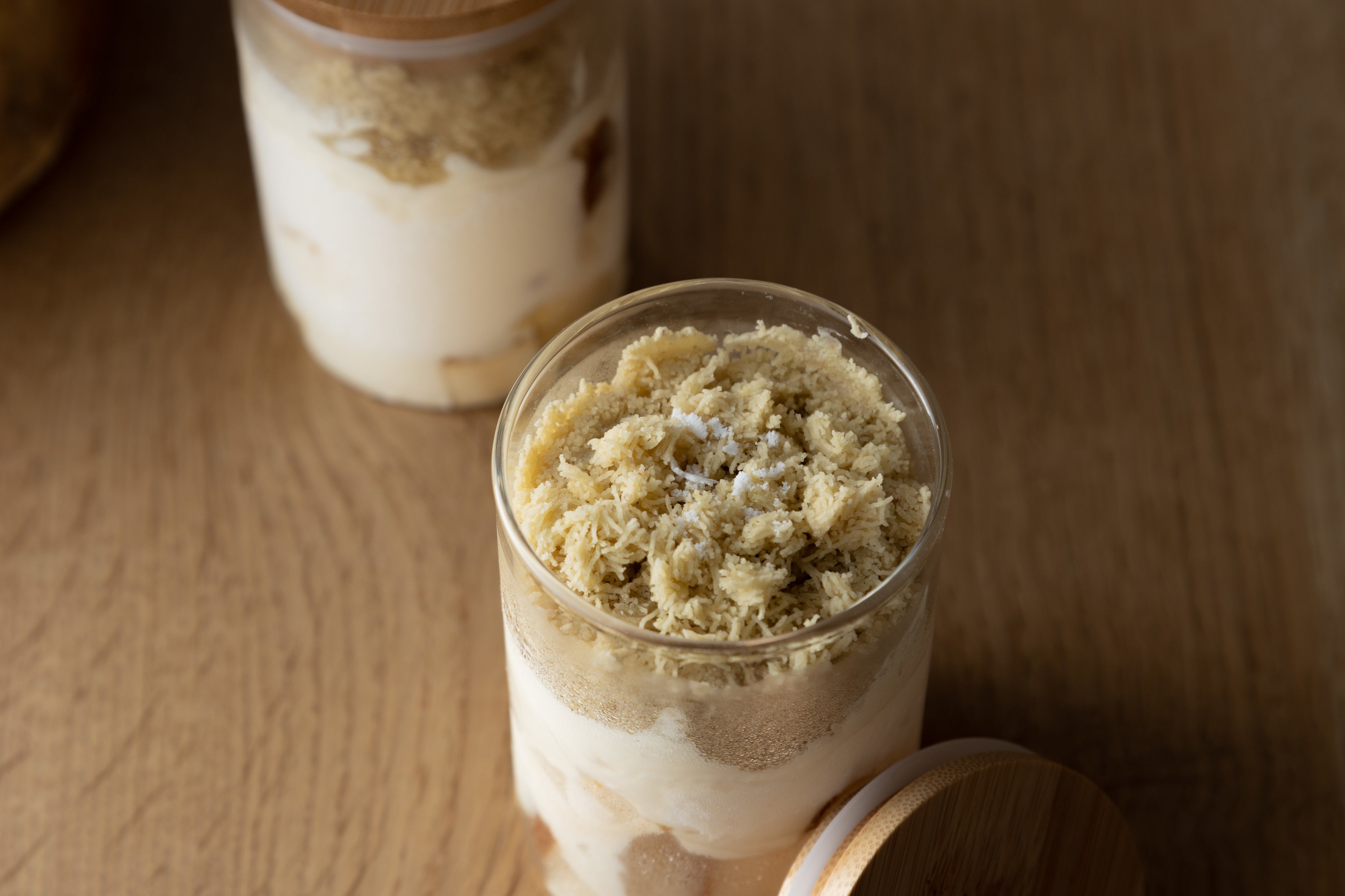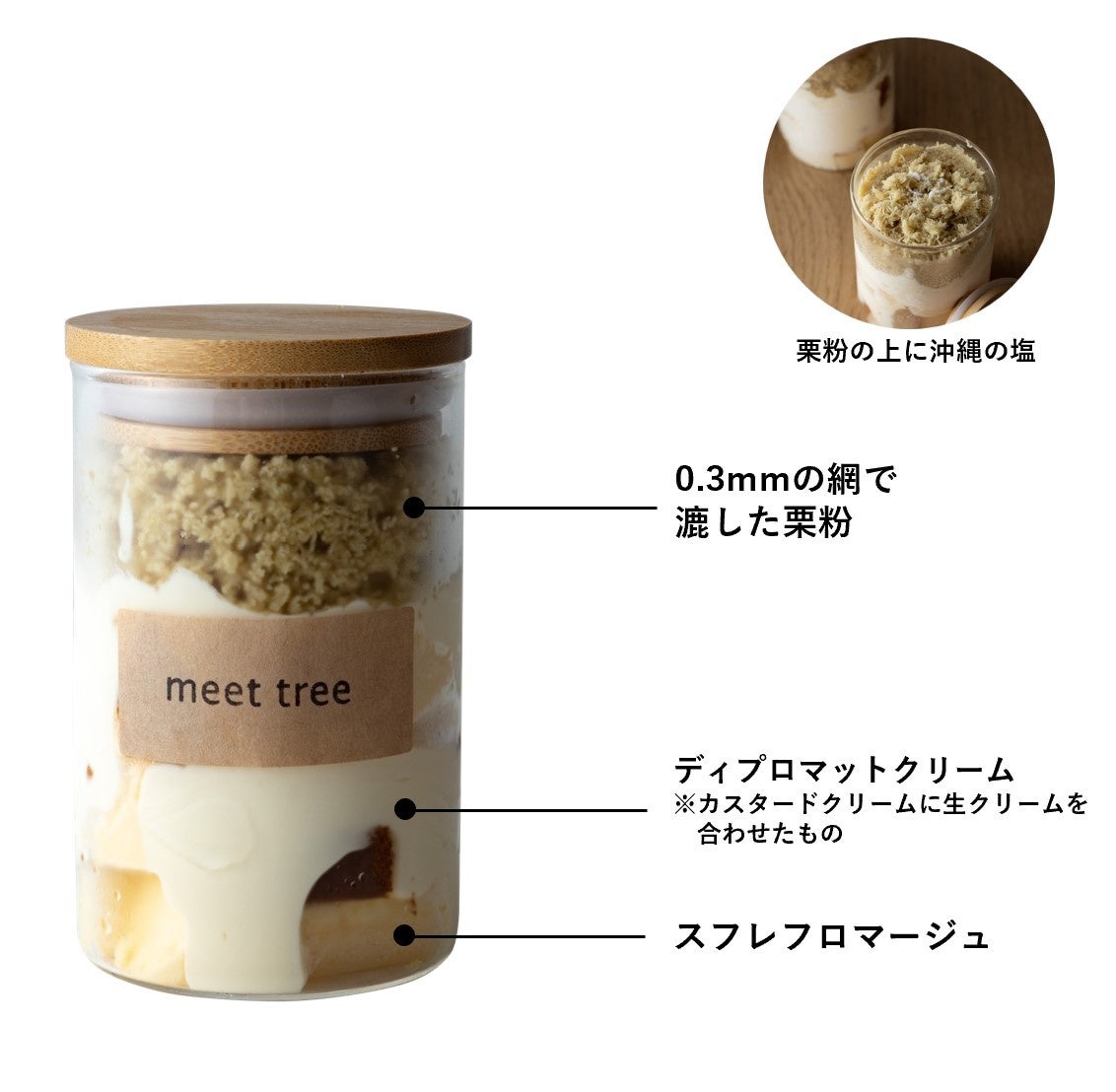 そこで、「地元の方以外にも召し上がっていただきたい」「並ばずに自宅で楽しめるモンブランを作りたい」という思いで完成したのが、テイクアウト専用商品「NAKATSUGAWA栗粉モンブラン~極0.3mm~」です。昨年1日最大200個売り上げた人気商品「meet tree 中津川プレミアムモンブラン」をモチーフに、ご自宅でも楽しめるサイズにしました。直径0.3mmの細さを“極”めたフワフワの栗粉が口の中でとろける新感覚のモンブランです。