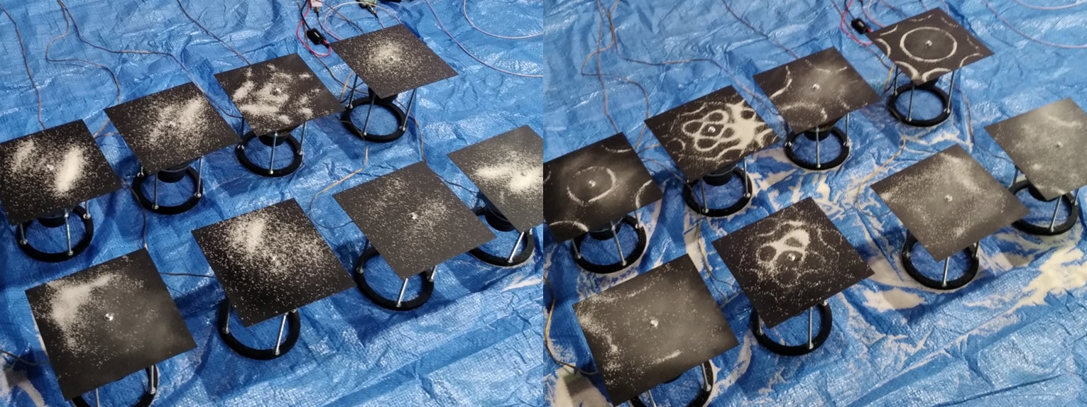 「8bit」は実感しづらい量子計算のイメージを体感できる作品です。最大の特徴は、超伝導量子コンピュータのqbitゲート制御におけるマイクロ波(電波)をリアルタイムに音波に変換し、クラドニ図形として表示していることです。多くの場合、qbitゲート制御(量子コンピューター上でのプログラミング・回路で利用される)はブロッホ球として扱われますが、本作品ではqbitをクラドニ図形として示すことで、ゲート制御におけるマイクロ波を図形として見ることができ、動きを理解することができます。