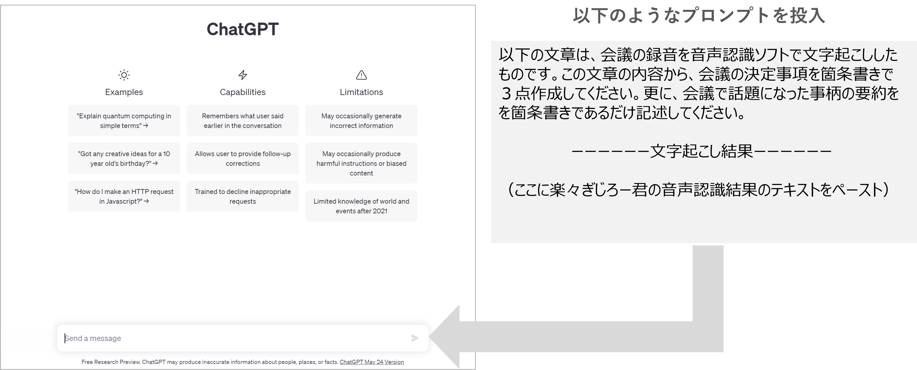 さらに、音声認識・文字起こし結果をChatGPTと組み合わせることで、議事要旨を一瞬で作成することができます。会議の発言内容を文字起こしした結果は話し言葉なので読みにくいことがあります。しかし、ChatGPTに対して適切なプロンプトと組み合わせて音声認識結果を入力するだけで簡単に議事要旨を作成することができます。