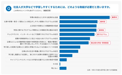 リカレント教育が重要視される一方、実際に社会人が大学・専門学校等で学習するにあたっての課題として、「費用」、「時間(短期プログラム、土日開講等)の配慮」、「情報を得る機会の拡充」、「企業の評価・環境整備」等が挙げられています。これらを解決するために、文部科学省では厚生労働省や経済産業省と連携し、リカレント教育を推進する施策に取り組んでいます。特に、大学・専門学校等でリカレント教育を実施するための体制整備や教育プログラム開発、地域単位のプラットフォーム構築等、社会人が働きながら学べる環境整備に加え、社会人にリカレント教育の情報が適切に届くよう、「マナパス」を継続的に運営しています。
