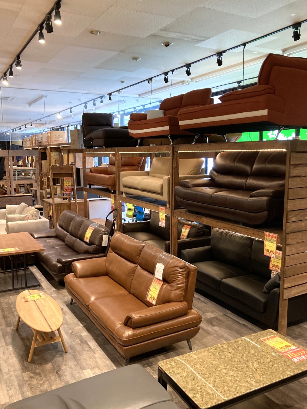 (佐賀県鳥栖市:ビッグウッド鳥栖店 ⇧ ) 三段に展示されたソファー