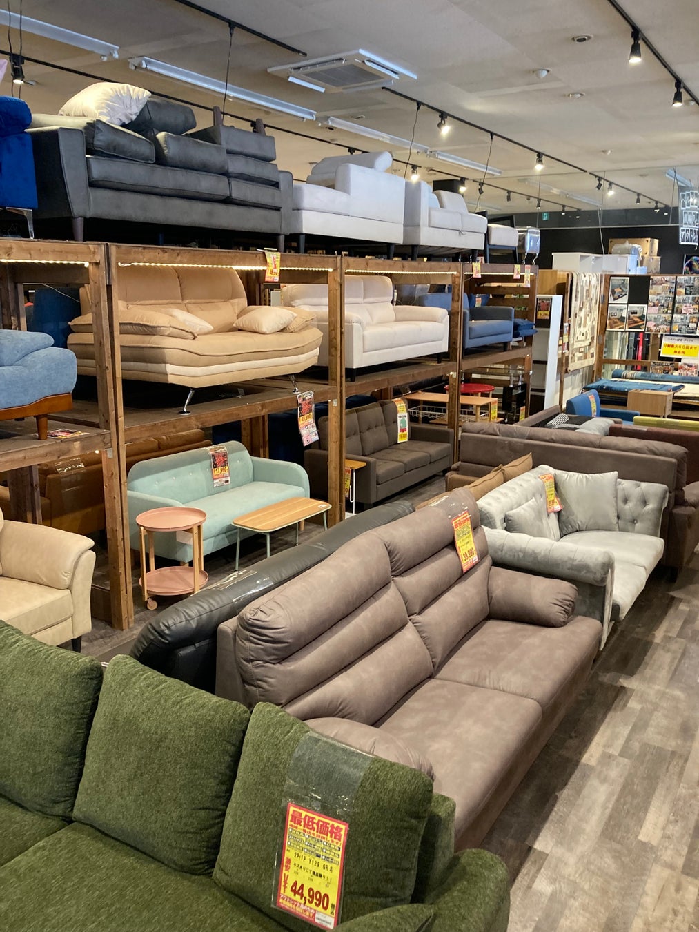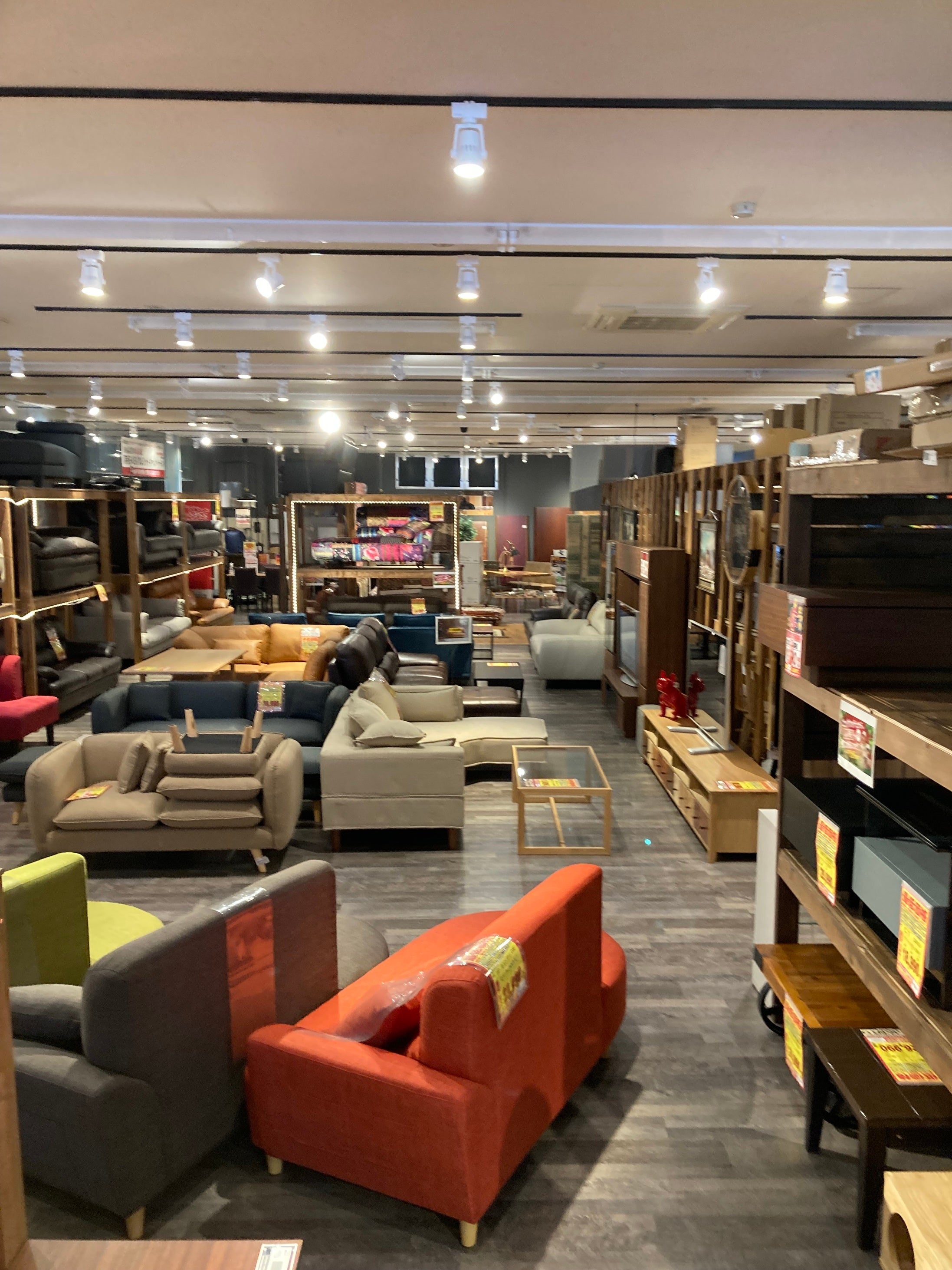すべて新品の店内には、3000点を超えるベッドやソファーの大型家具から座椅子など軽家具、さらにインテリア雑貨が所狭しと並んでおり見るだけでも楽しいですよ♪