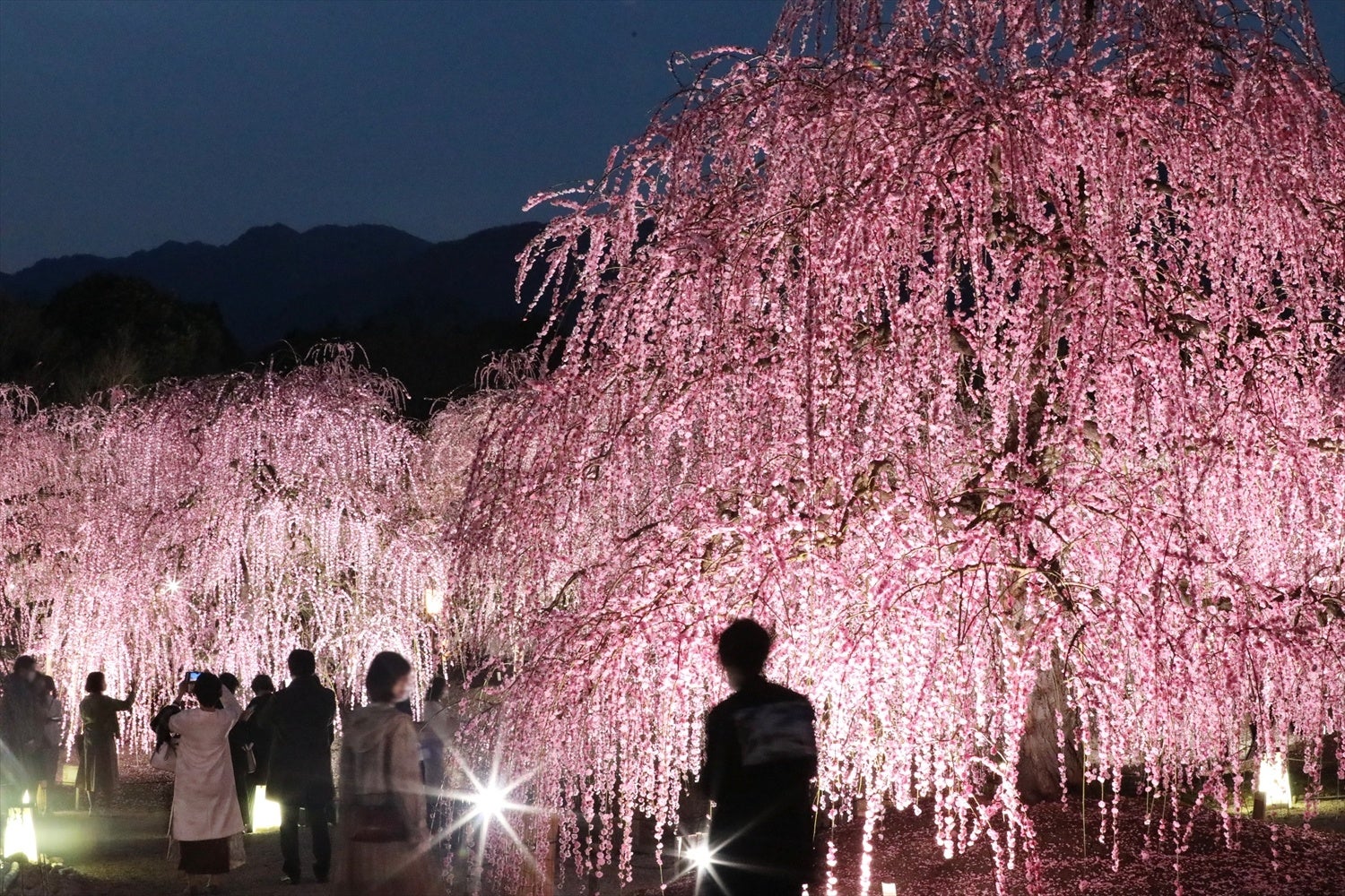 また、見頃の時期には夜間ライトアップも行います。黄昏の山の稜線を望みながら、あるいは漆黒の闇に包まれて、シャンデリアのように照らし出されたしだれ梅の幽玄な世界は、当園でしか味わえない感動の絶景として人気を集めています。