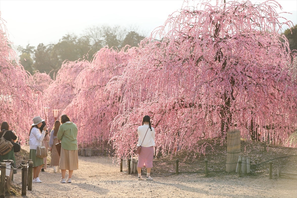 本年は3月上旬から中旬にかけて呉服しだれの見頃が始まると予想しています。花びらが散り始めて以降も、ピンクの絨毯のように花びらが積もる姿が楽しめるなど見頃が続きます。また、見頃終盤には、職人による剪定作業の実演(ガイド付き)も予定しています。